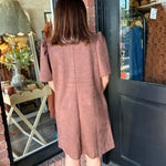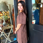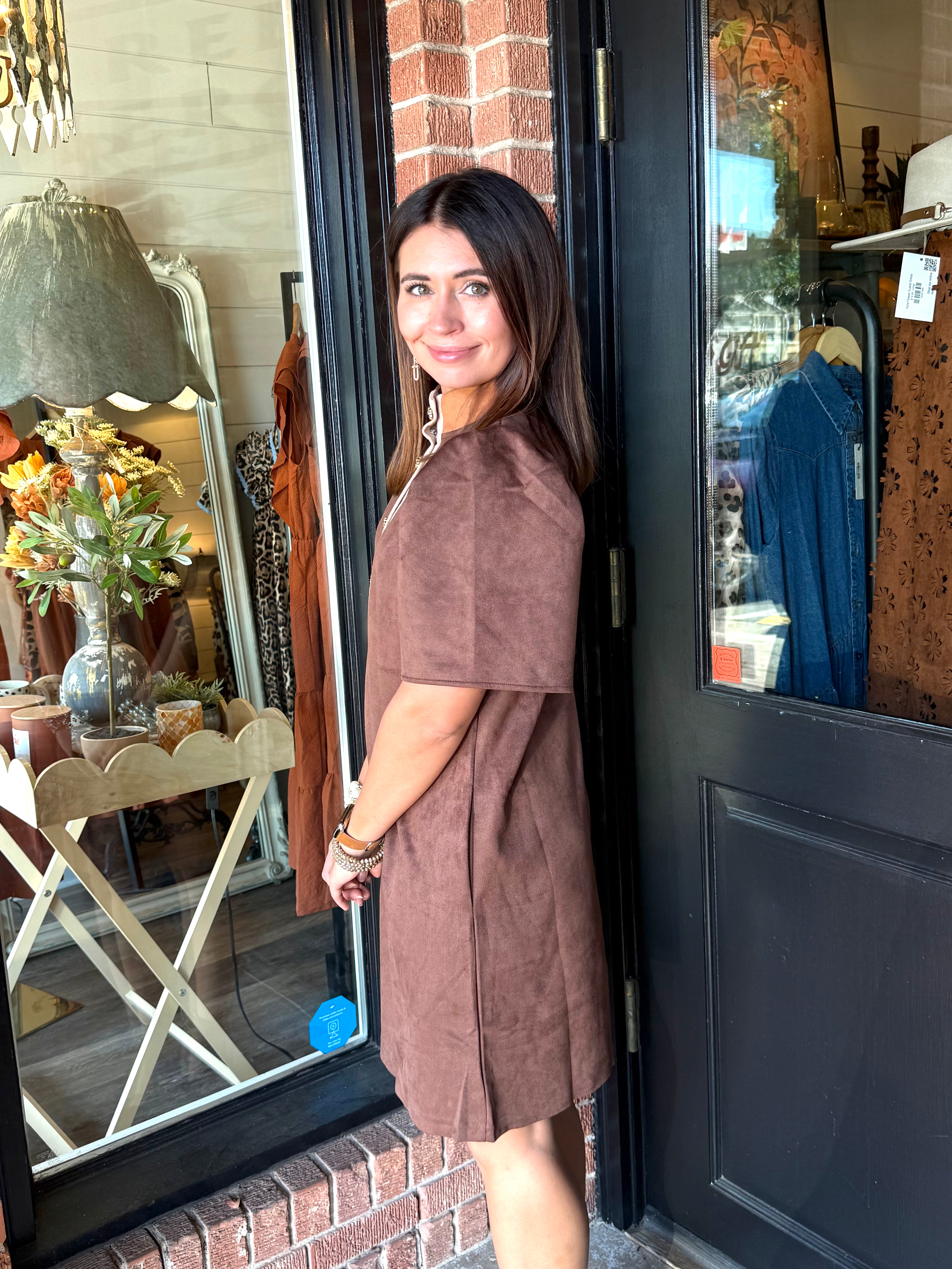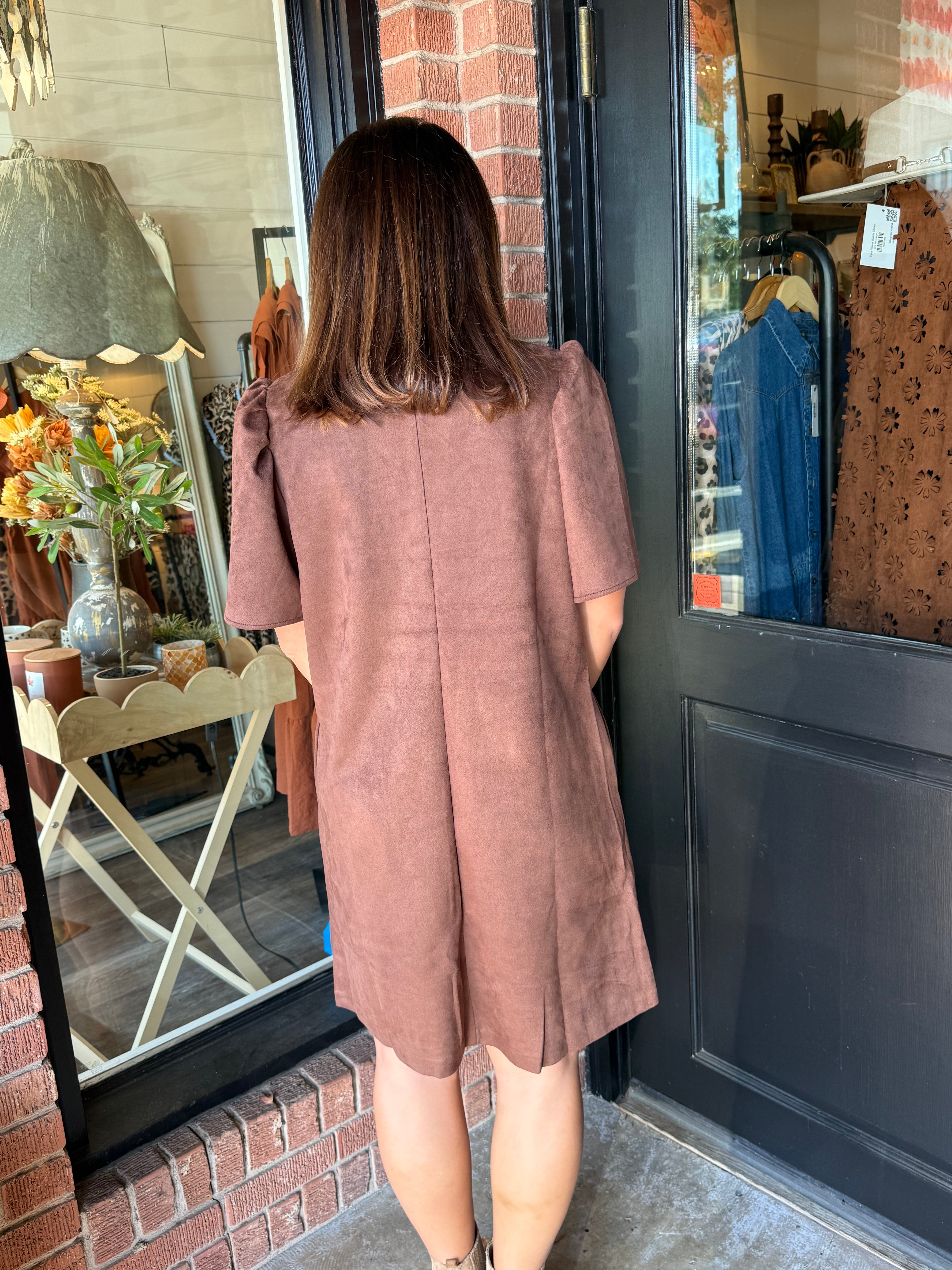 Sarah Short Sleeve Suede Dress with Gold Button Neck