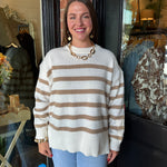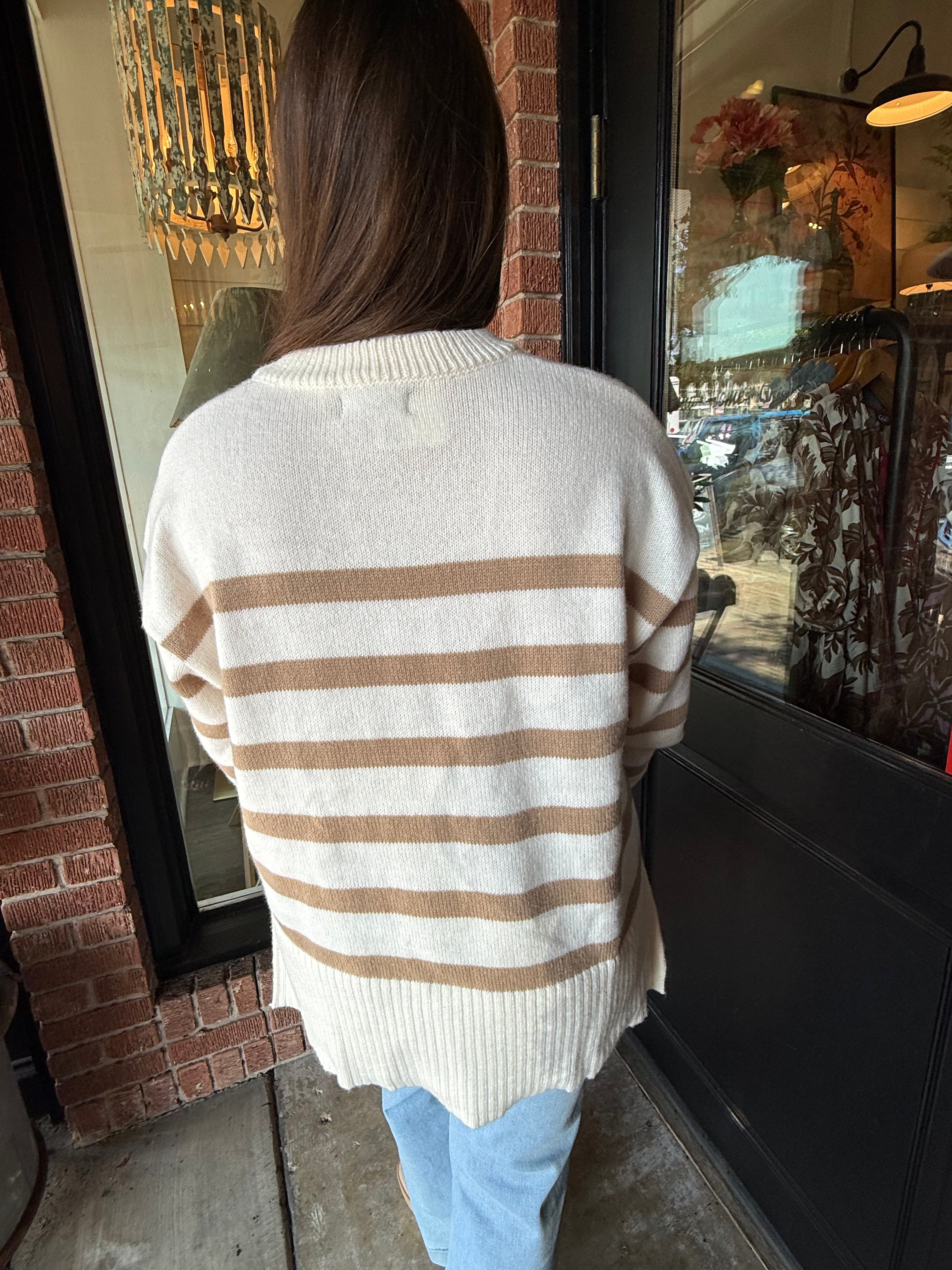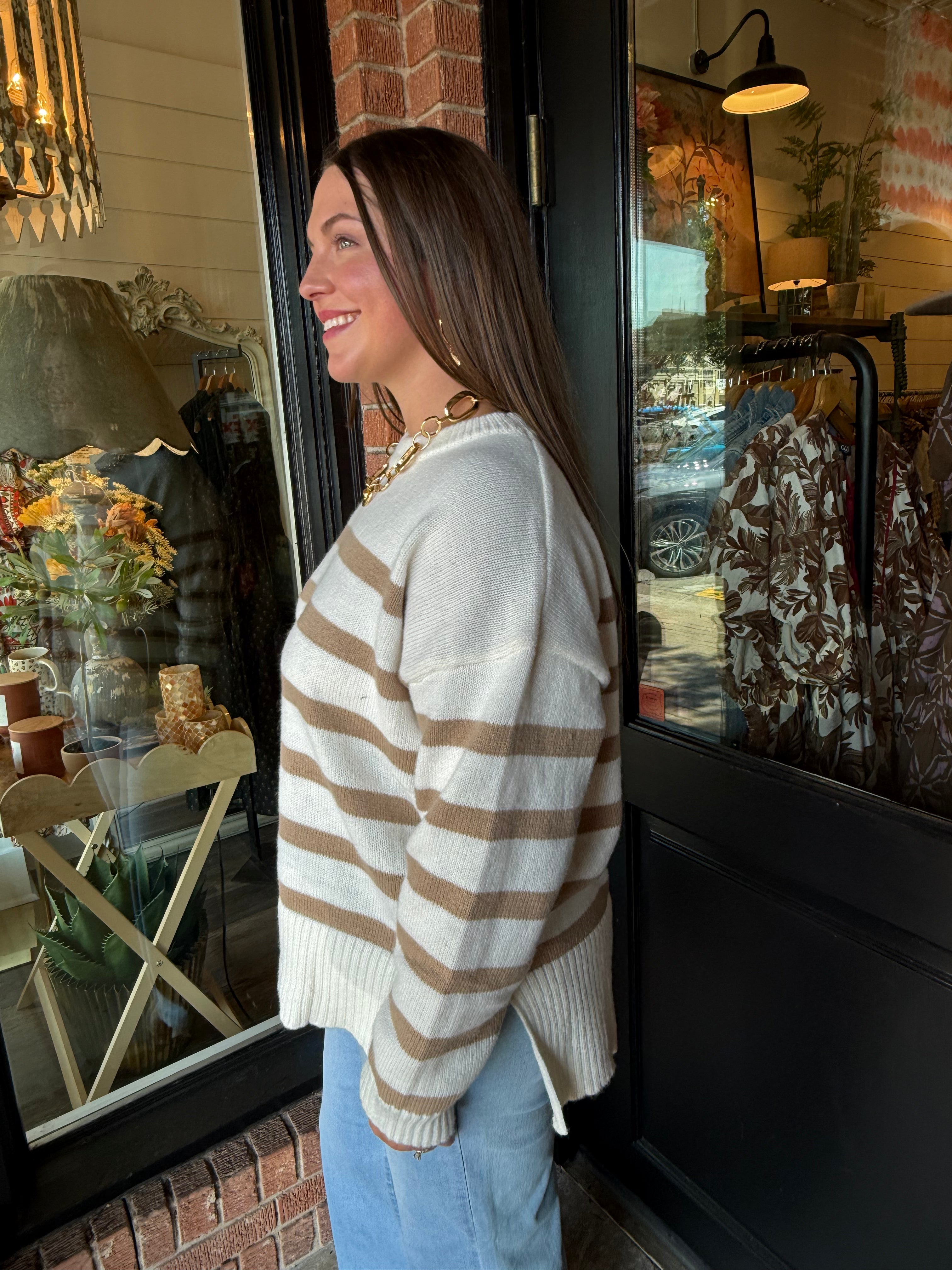 Effortlessly casual and stylish, the Scarlet Oversize Striped Pullover Sweater is perfect for cozy days and laid-back looks. Designed with a relaxed, oversized fit and dropped shoulders, it offers a flattering silhouette while keeping you comfortable. The round neckline and long sleeves provide classic appeal, and the side slit adds a subtle, modern detail. Pair it with your favorite jeans or leggings for a chic, everyday outfit.