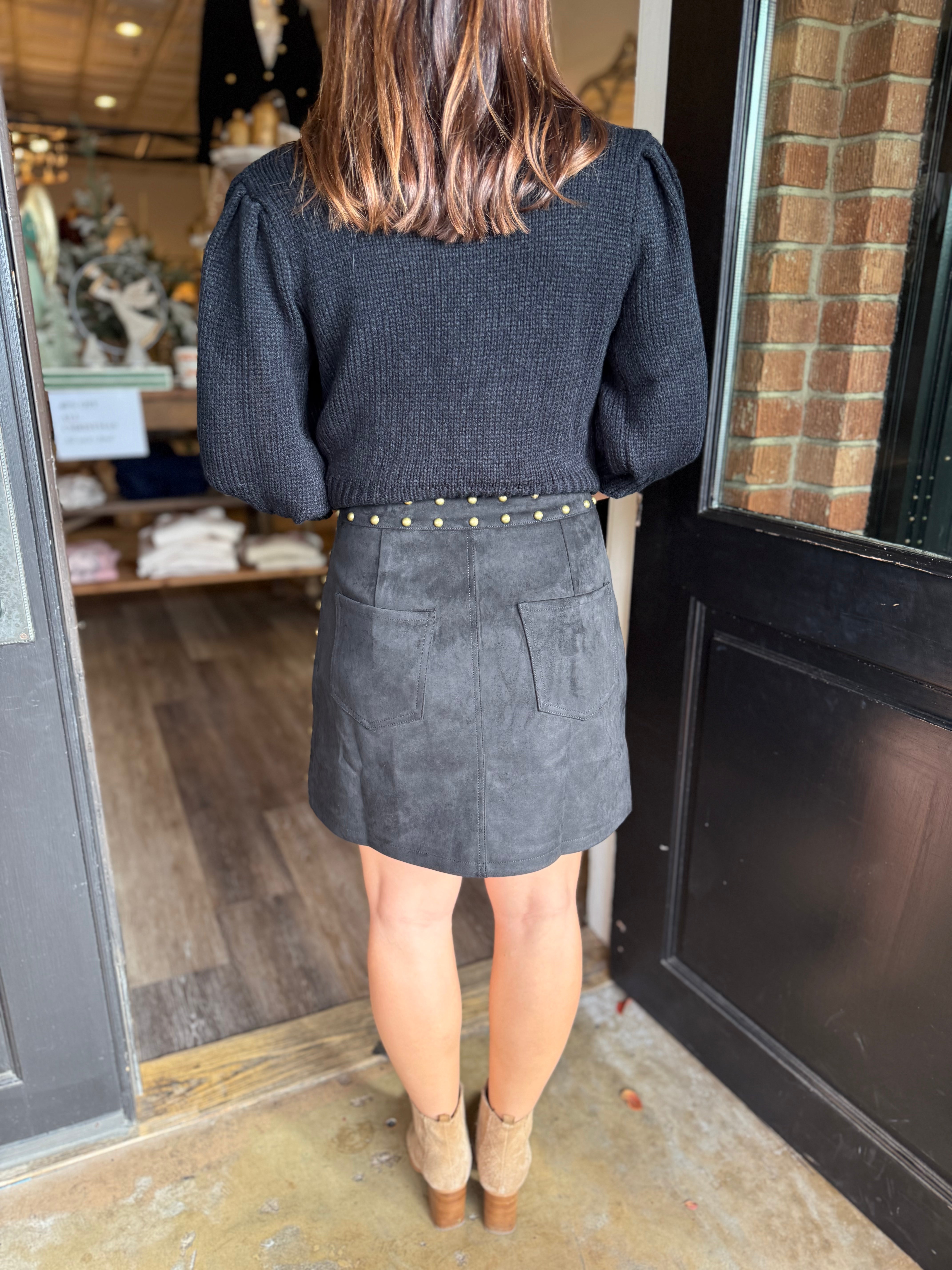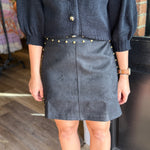 Chic, sleek, and full of attitude — the Selina Suede Mini Skirt is a standout piece for fall and beyond. Designed in a soft suede finish, this mini features brass stud detailing along the waistband and side seams for just the right touch of edge.