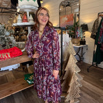 Romantic, flowy, and full of feminine charm — the Serena Paisley Ruffle Tiered Midi Dress is a standout piece crafted in an exclusive print. The chic collared neckline and classic button-down placket add structure, while the long puff sleeves with buttoned cuffs bring soft volume. An elastic waist with a tying sash belt creates a flattering silhouette, and the tiered ruffle midi skirt adds beautiful movement with every step.
