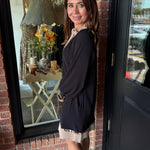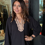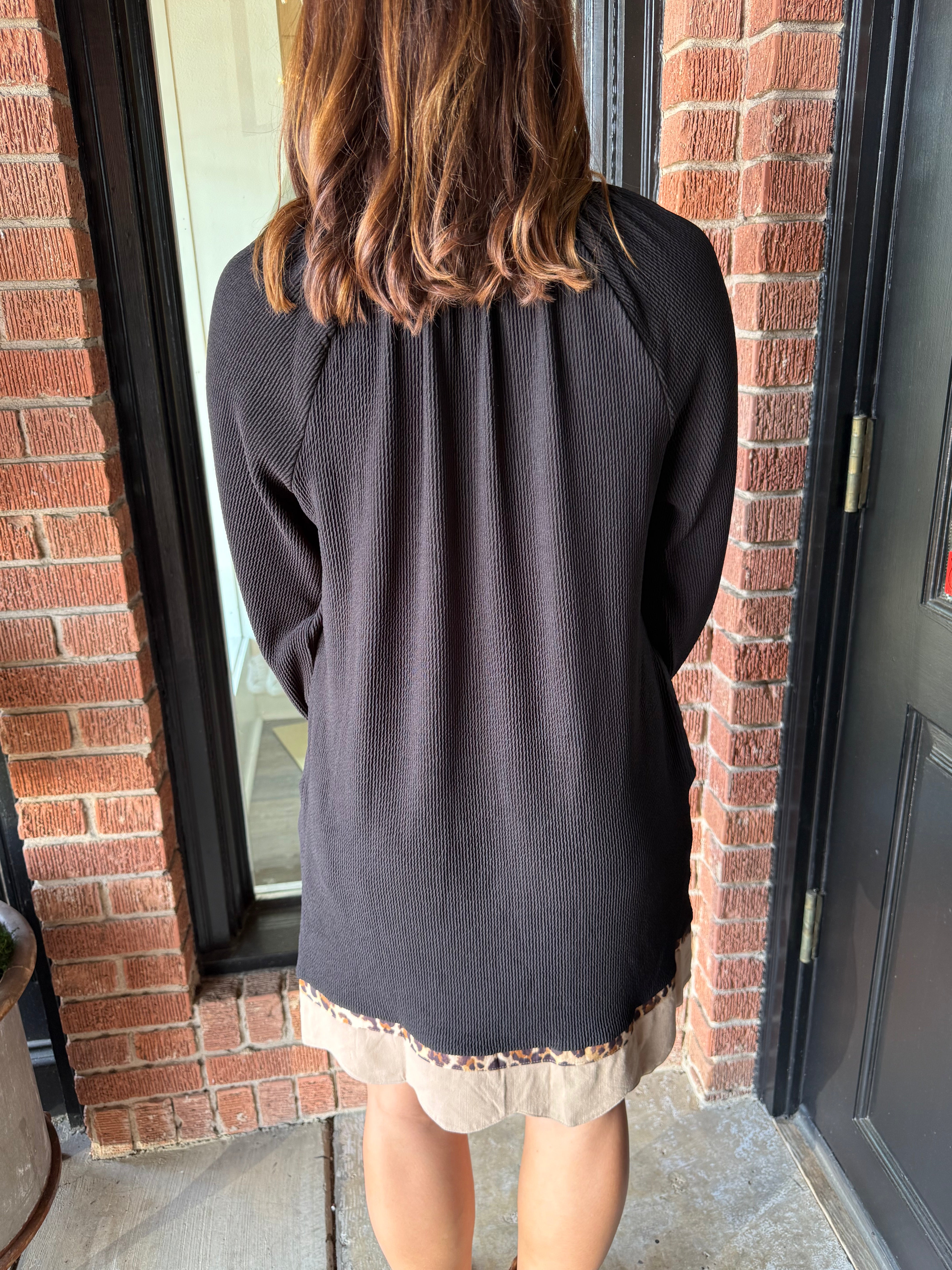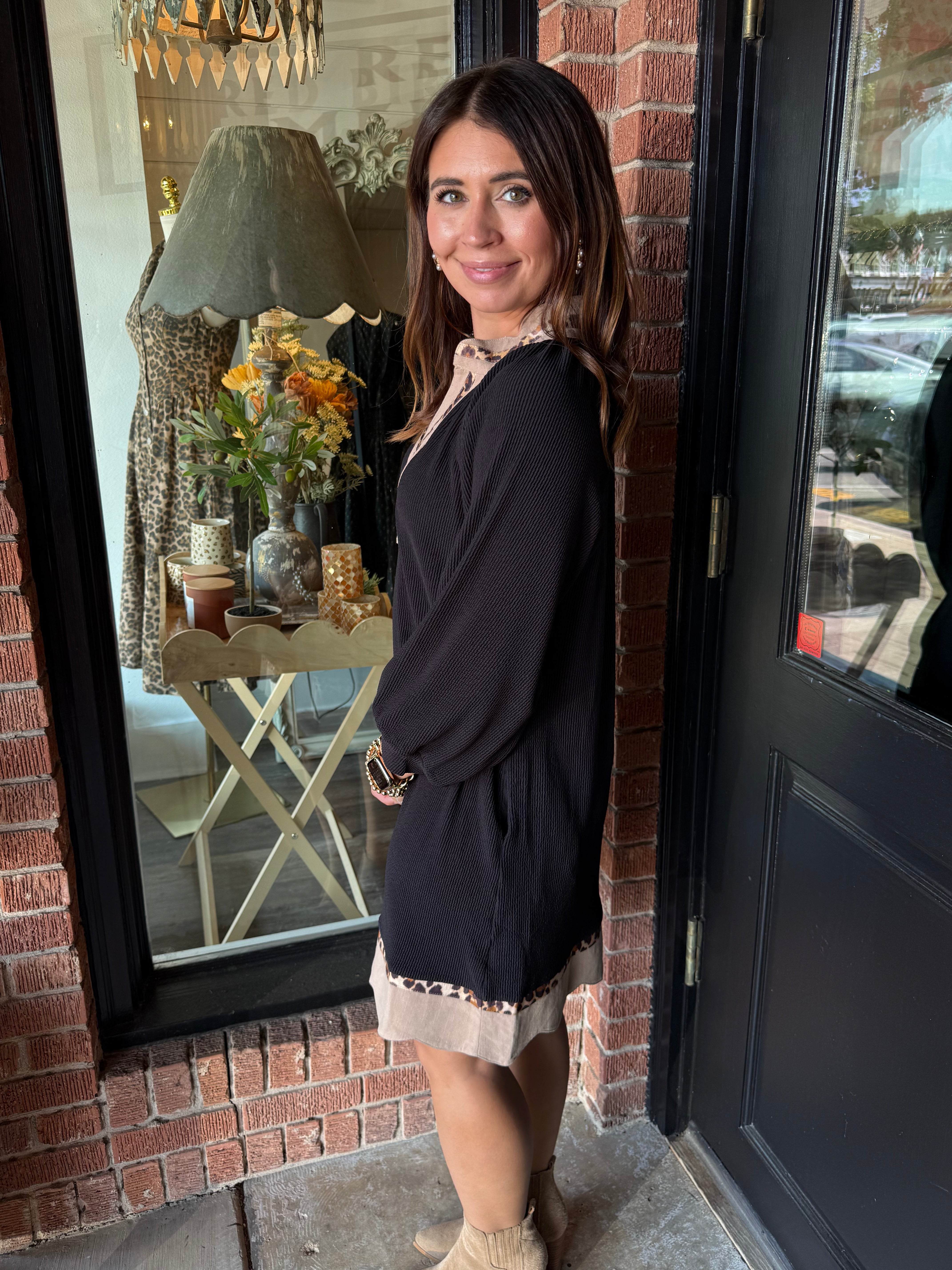 The Shawna Leopard Dress is a bold mix of texture and detail, designed to stand out in any season. Made with ribbed fabric and a striking animal contrast, this dress features a flattering V-neckline with scalloped edges and leopard trim. The 3/4 length balloon sleeves and scalloped hem add a feminine finish, while the soft stretch blend makes it as comfortable as it is stylish.