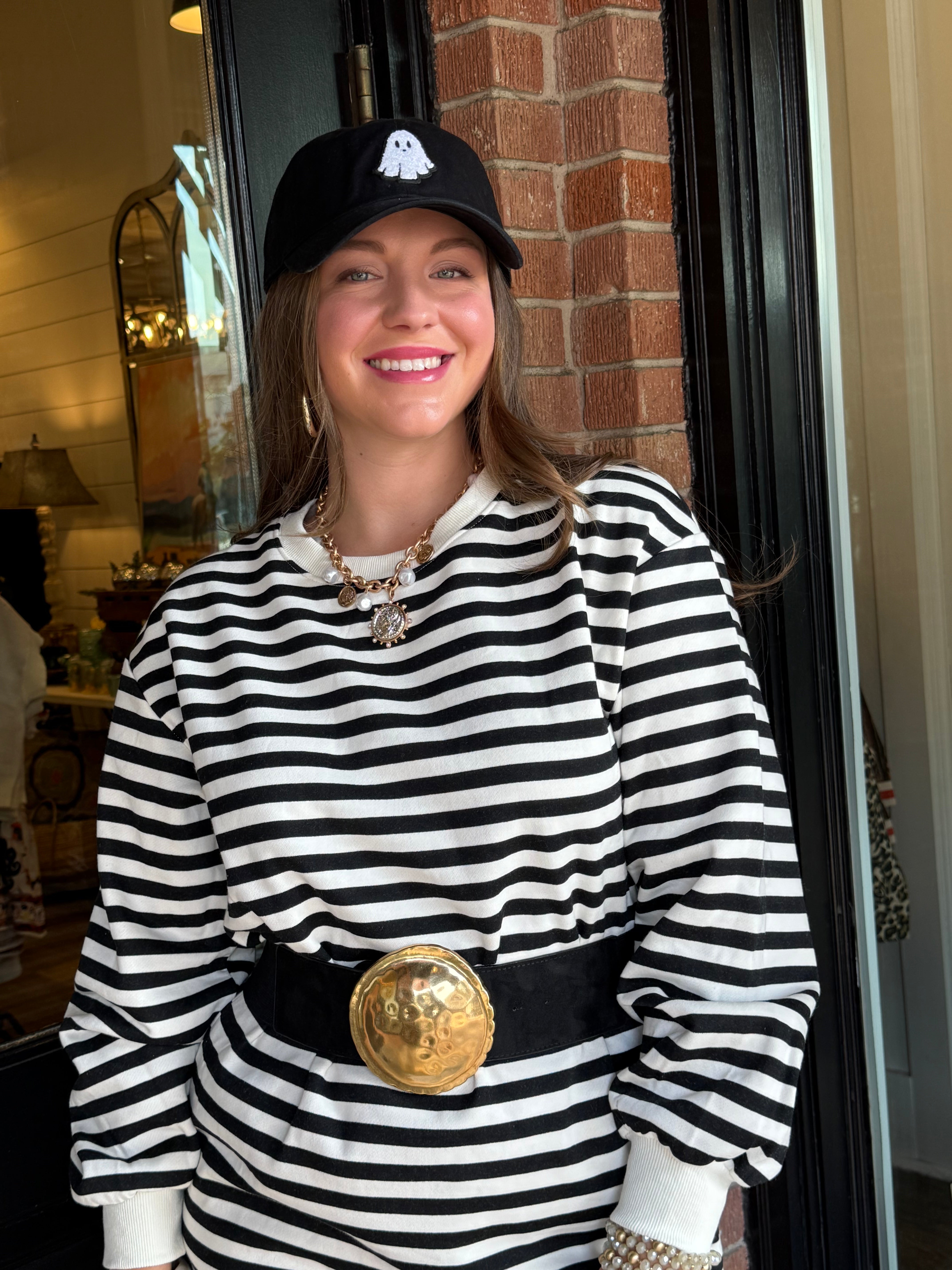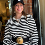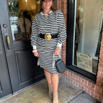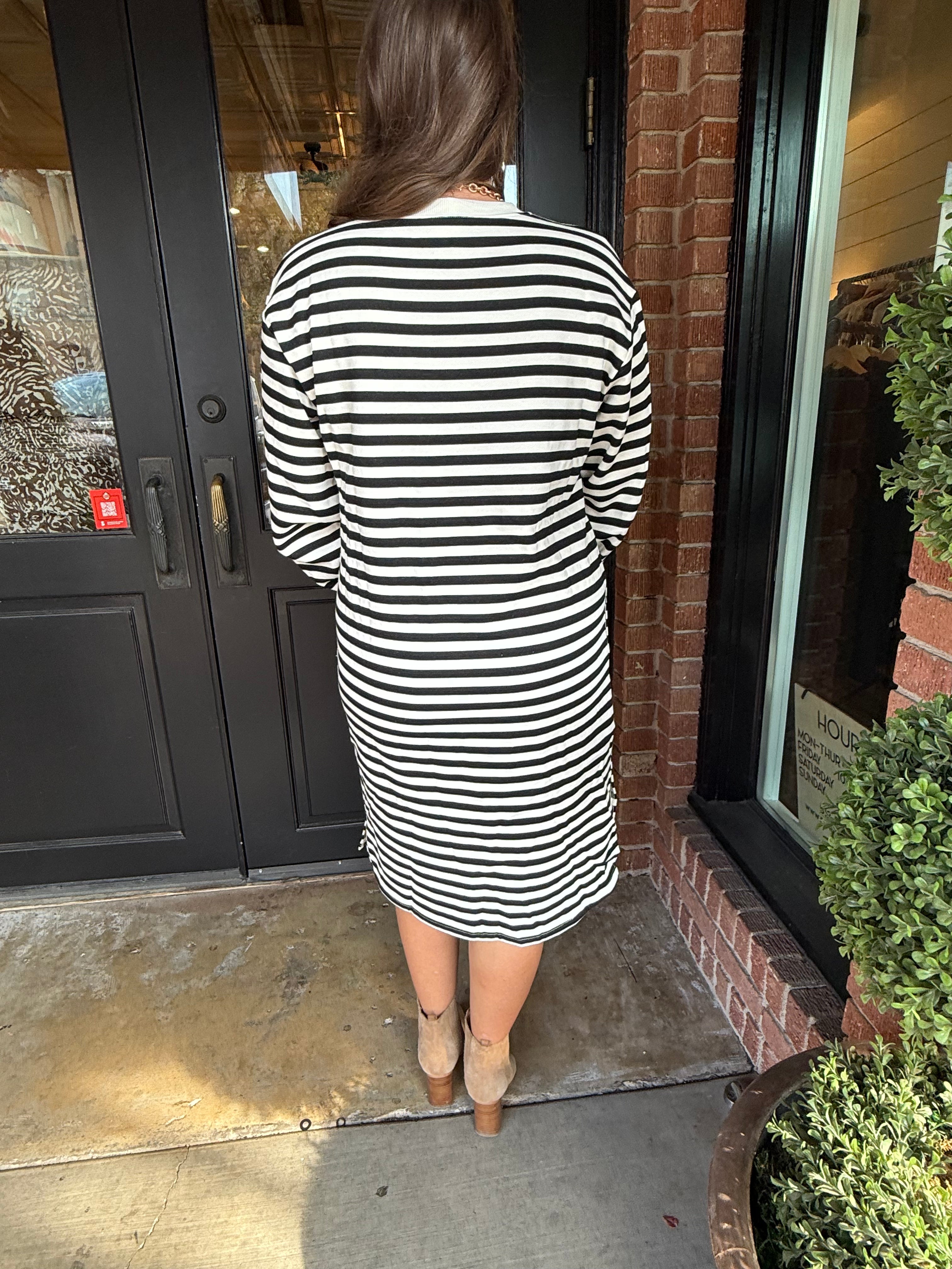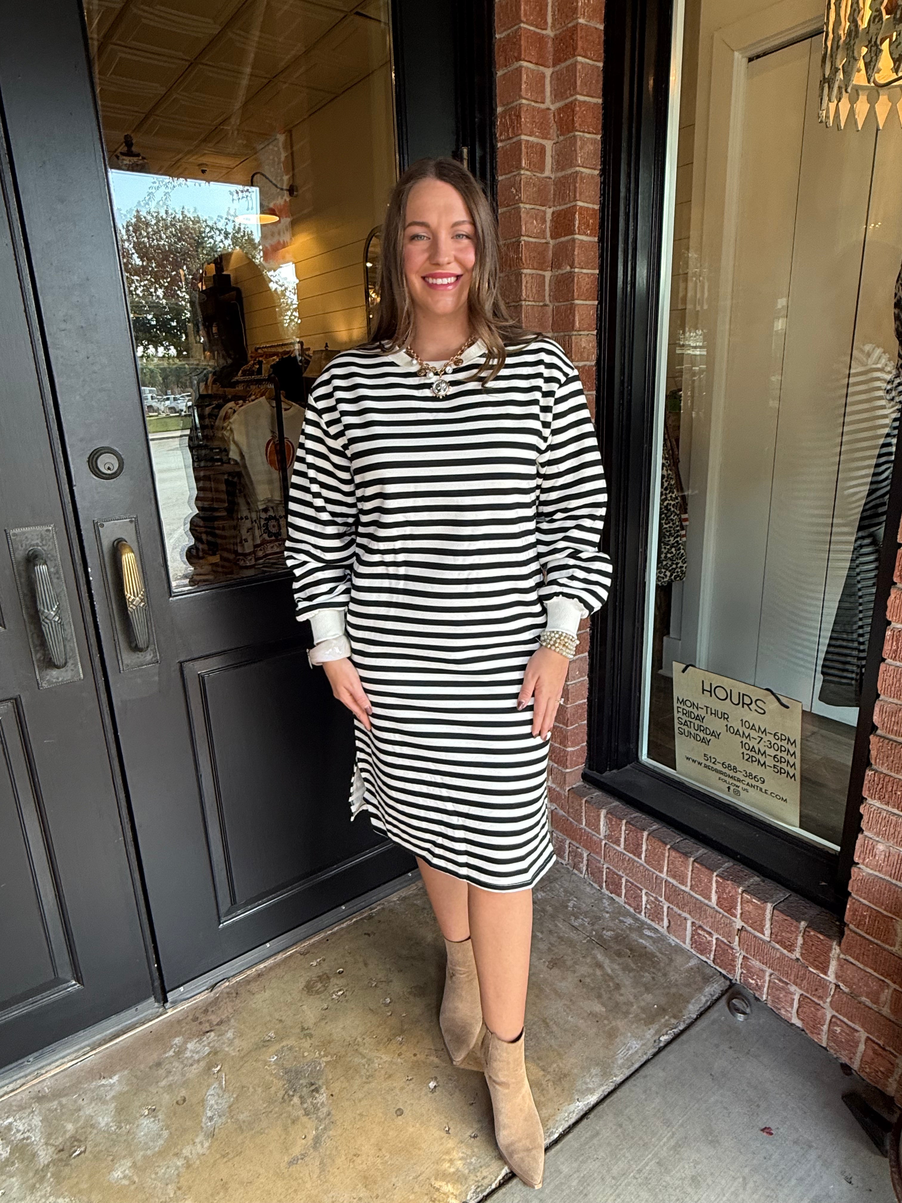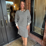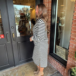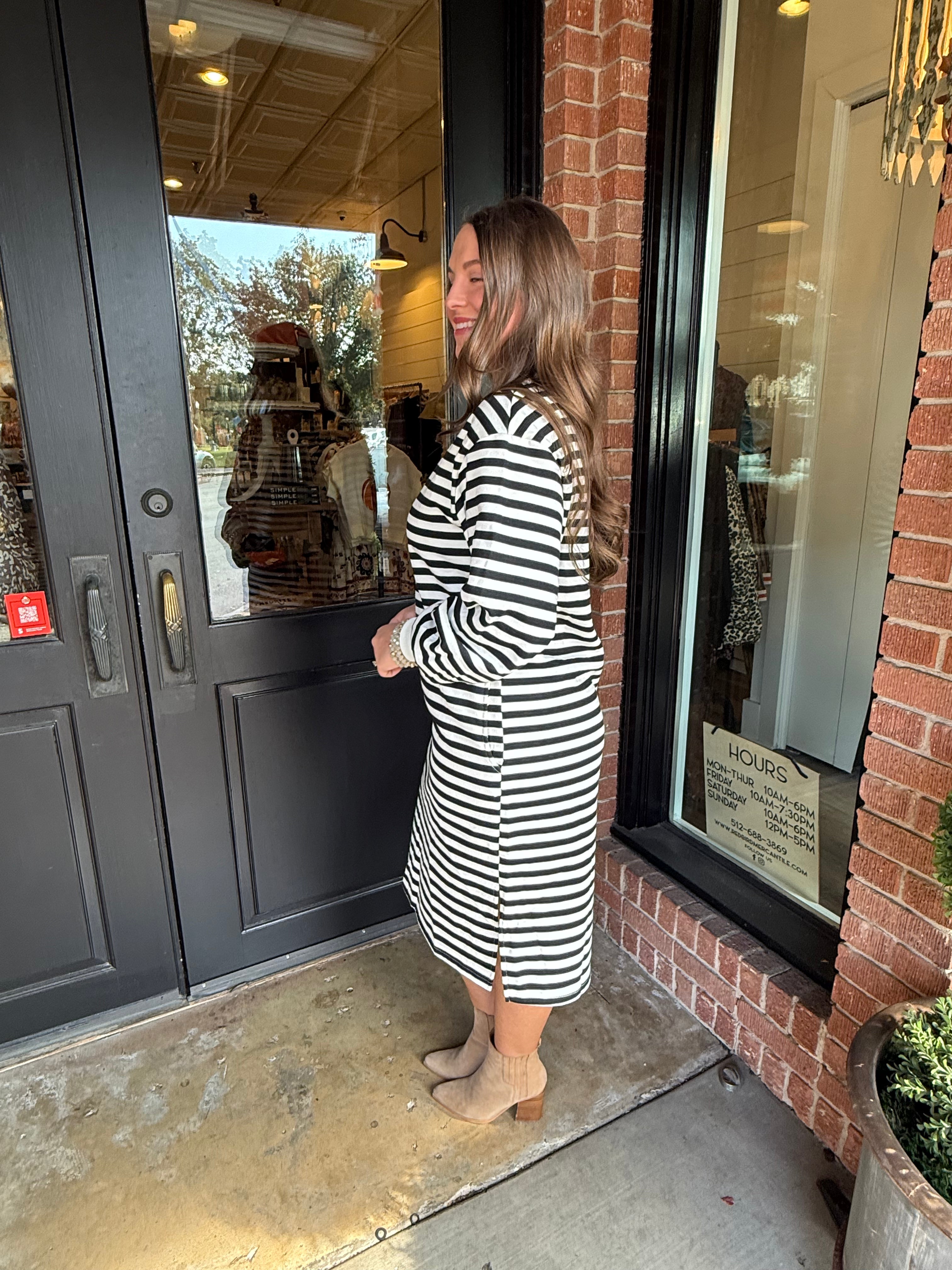 Casual comfort meets everyday style in the Shelley Striped Midi Dress. Crafted from soft French terry fabric, this relaxed long-sleeve dress features classic stripes and an easy silhouette that’s perfect for laid-back days or weekend outings.
