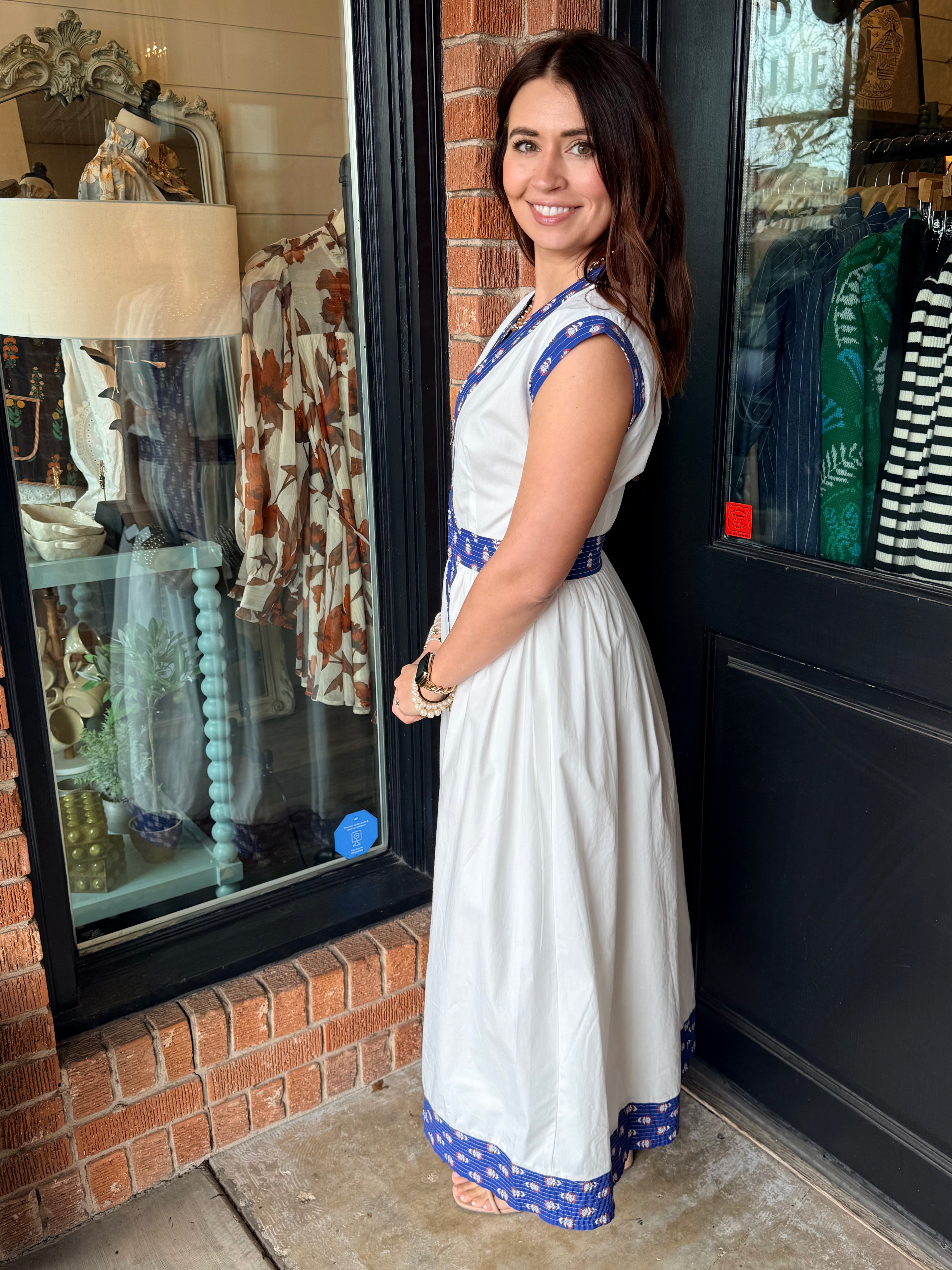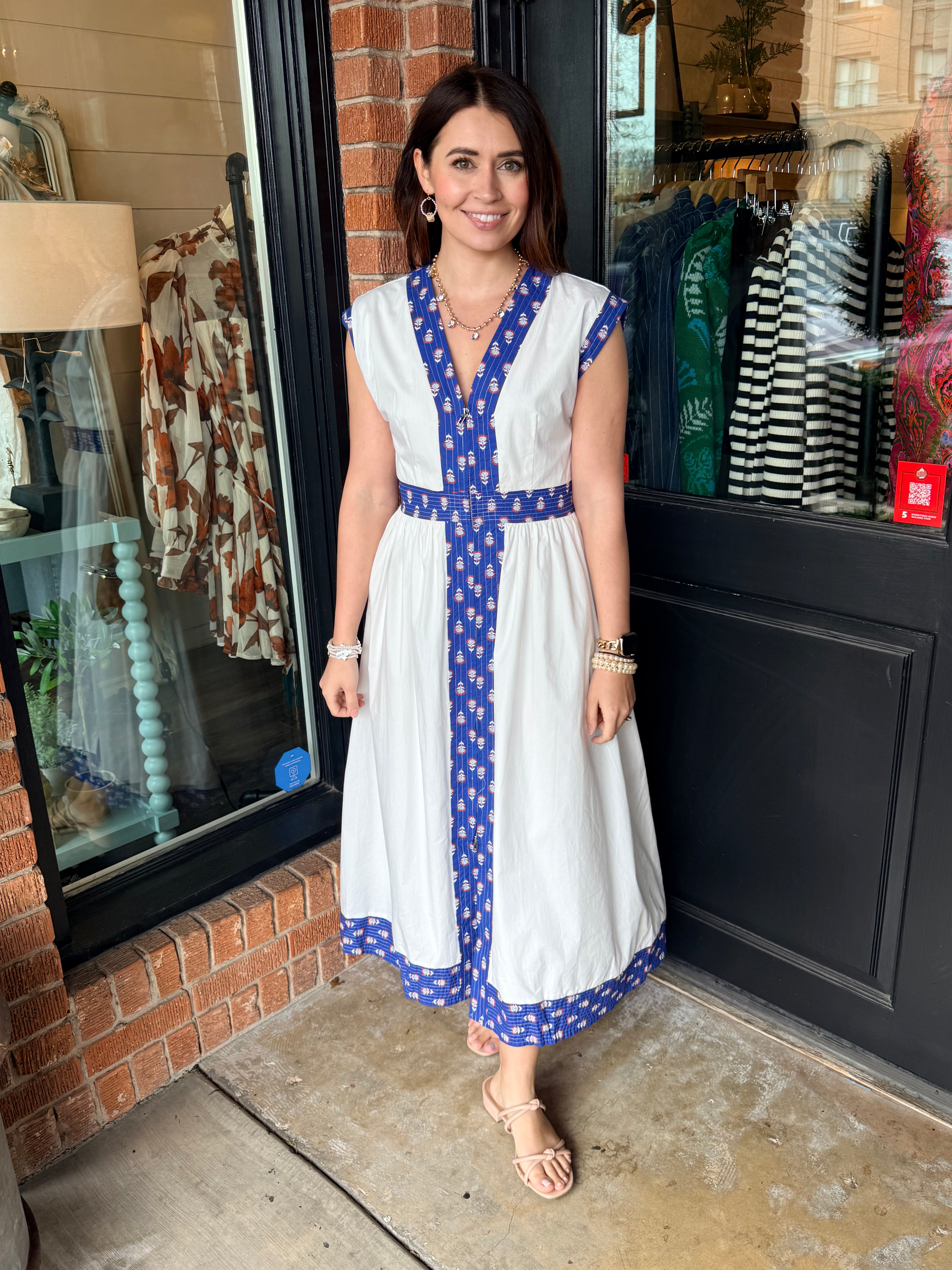 Chic with just the right amount of detail, the Sophie Printed Trim Midi Dress is designed to stand out in the most effortless way. Featuring eye-catching printed trim along the neckline, sleeves, waist, and hem, this midi brings a beautifully framed look to a flattering silhouette. The zip-front V-neckline lets you customize the look, while cap sleeves and a softly gathered skirt create a feminine shape that moves with you. It’s the perfect mix of polished and playful—ideal for brunch, showers, dinners, and everything in between. A dress that feels special the moment you slip it on—easy to wear, easy to love.