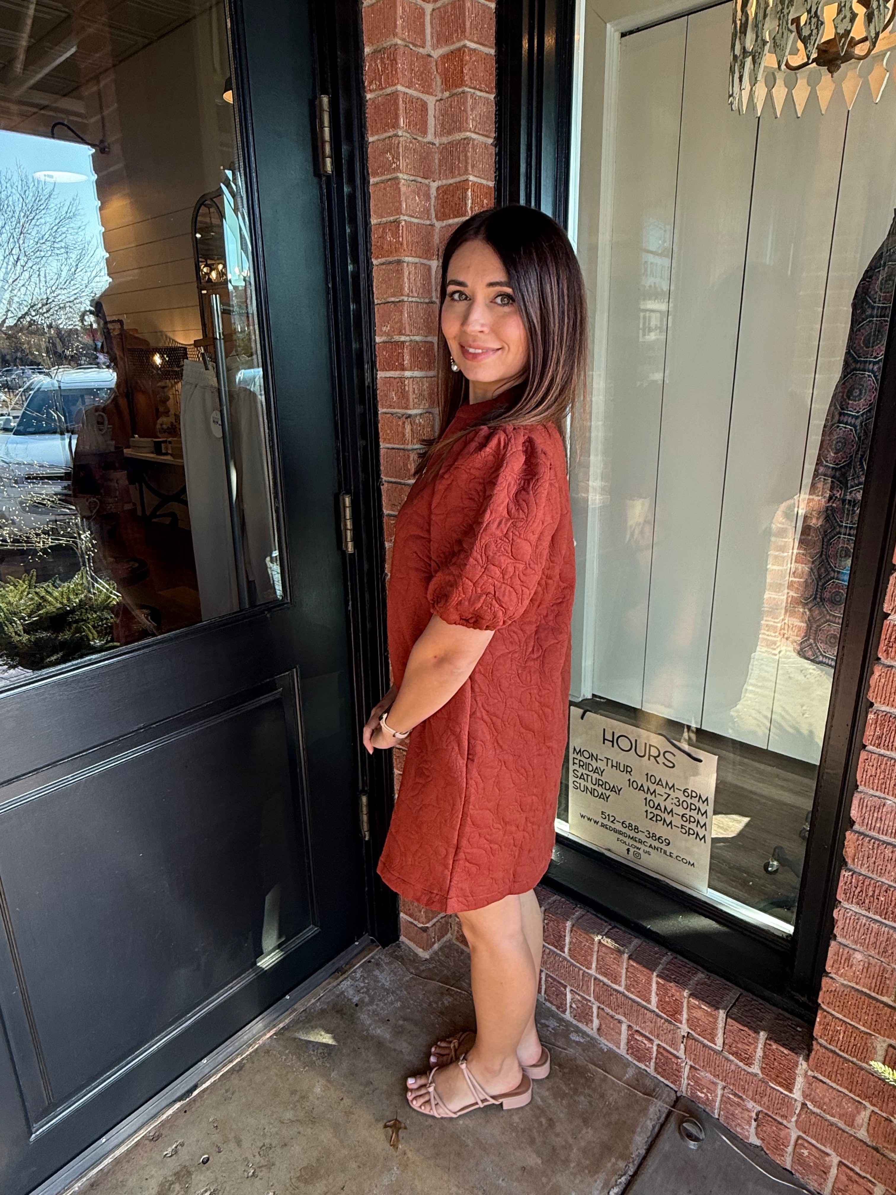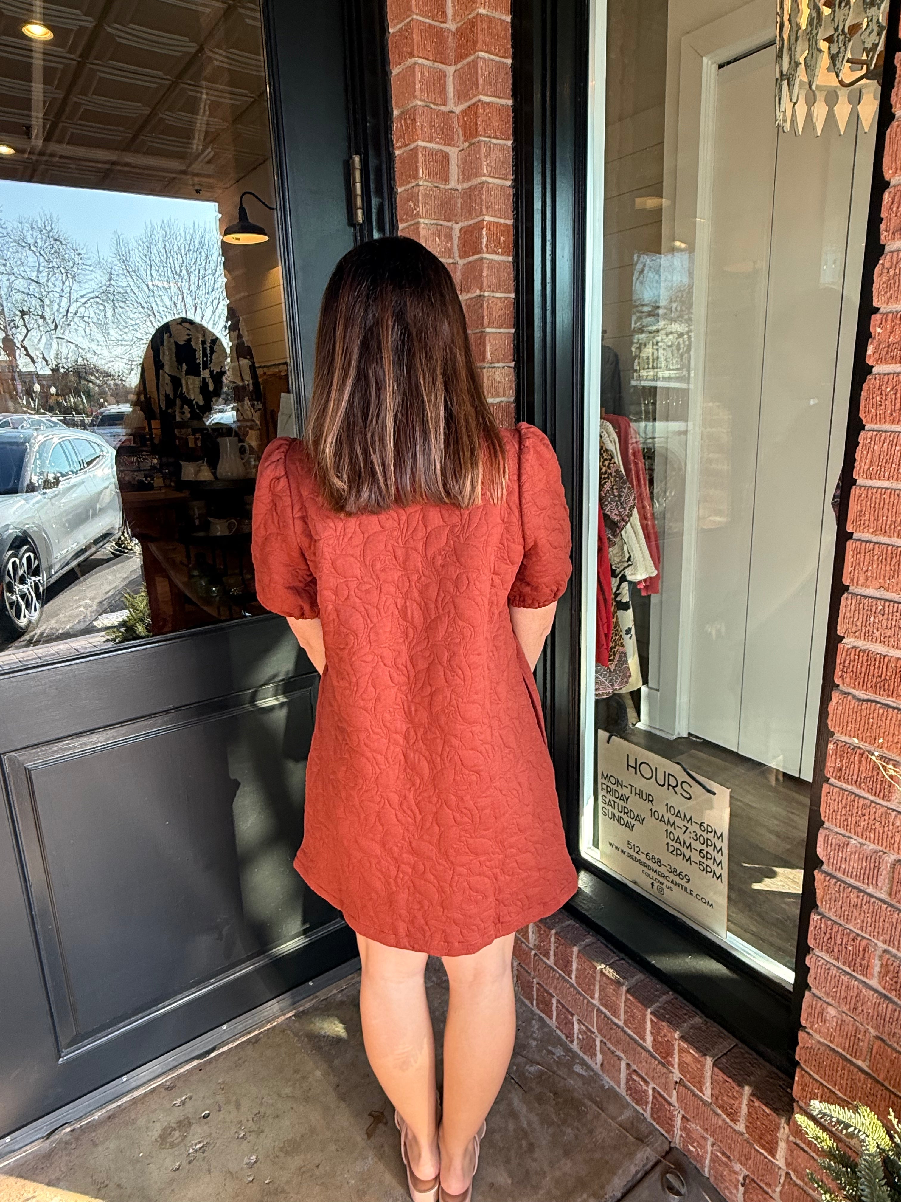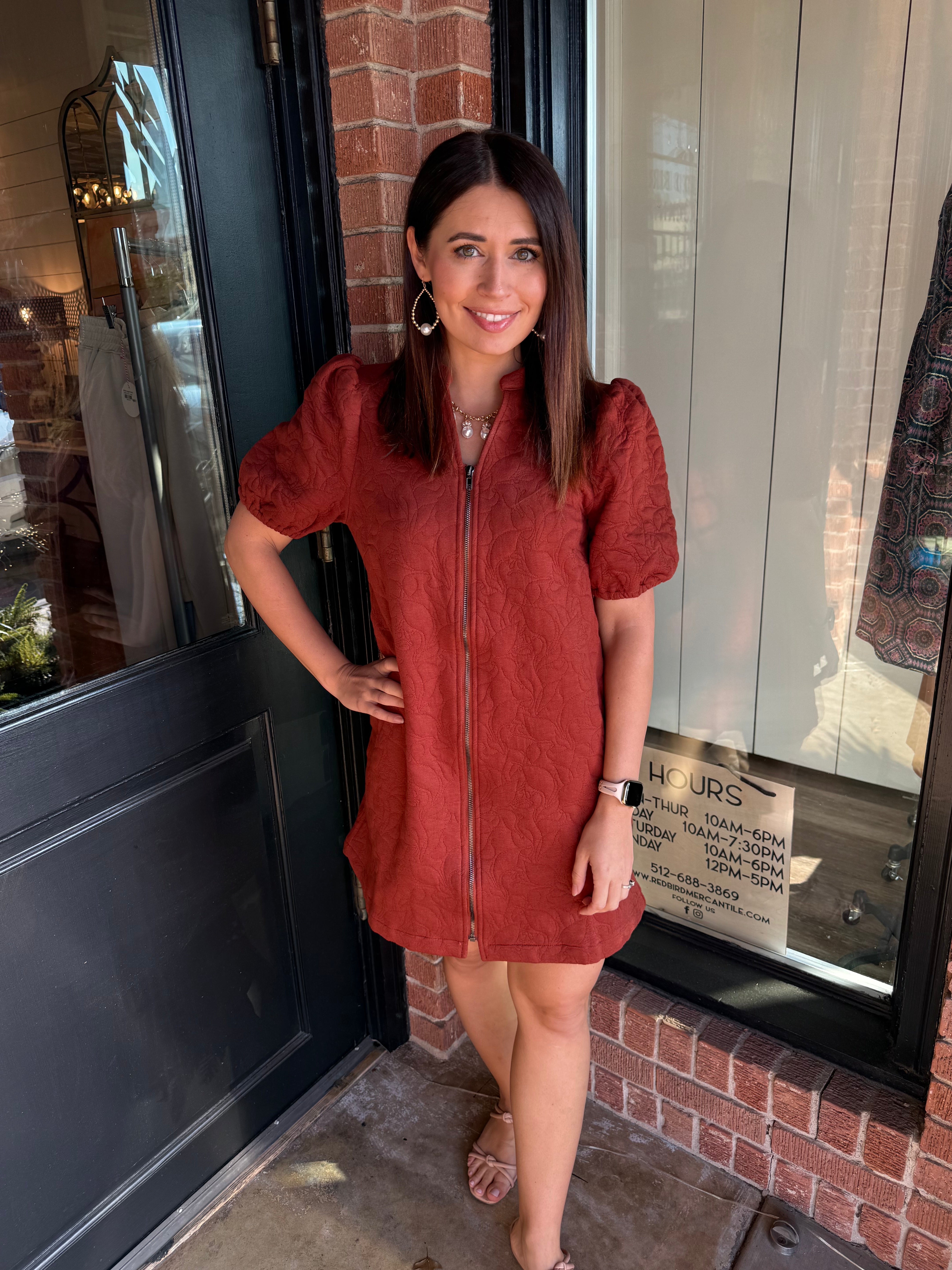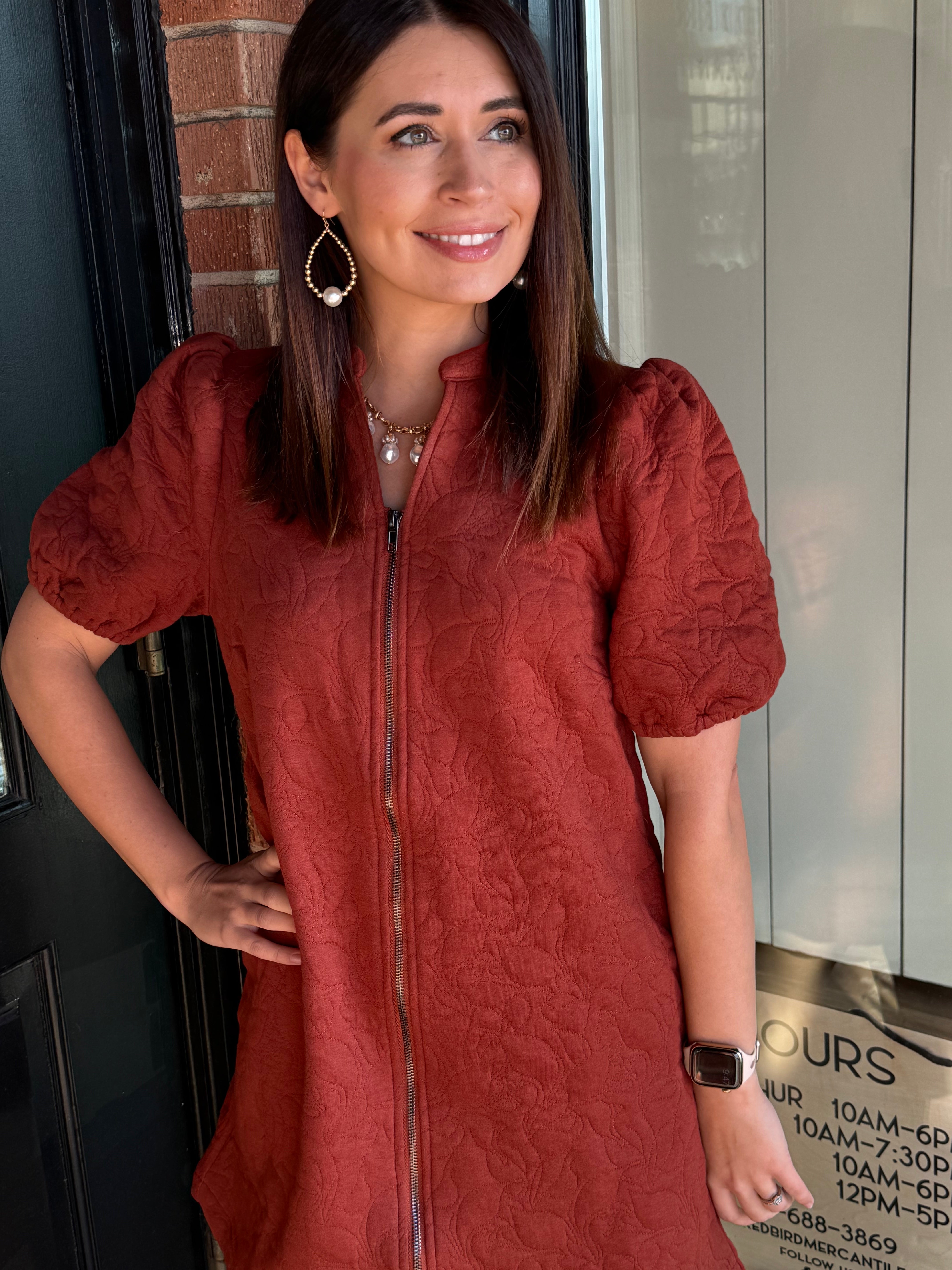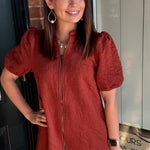 Charming with a modern edge, the Statia Quilted Floral Mini Dress features a textured jacquard floral design that sets it apart. The full front zipper and puff sleeves add a stylish touch, while the quilted fabric gives structure and comfort. An easy statement piece you can dress up or keep casual.