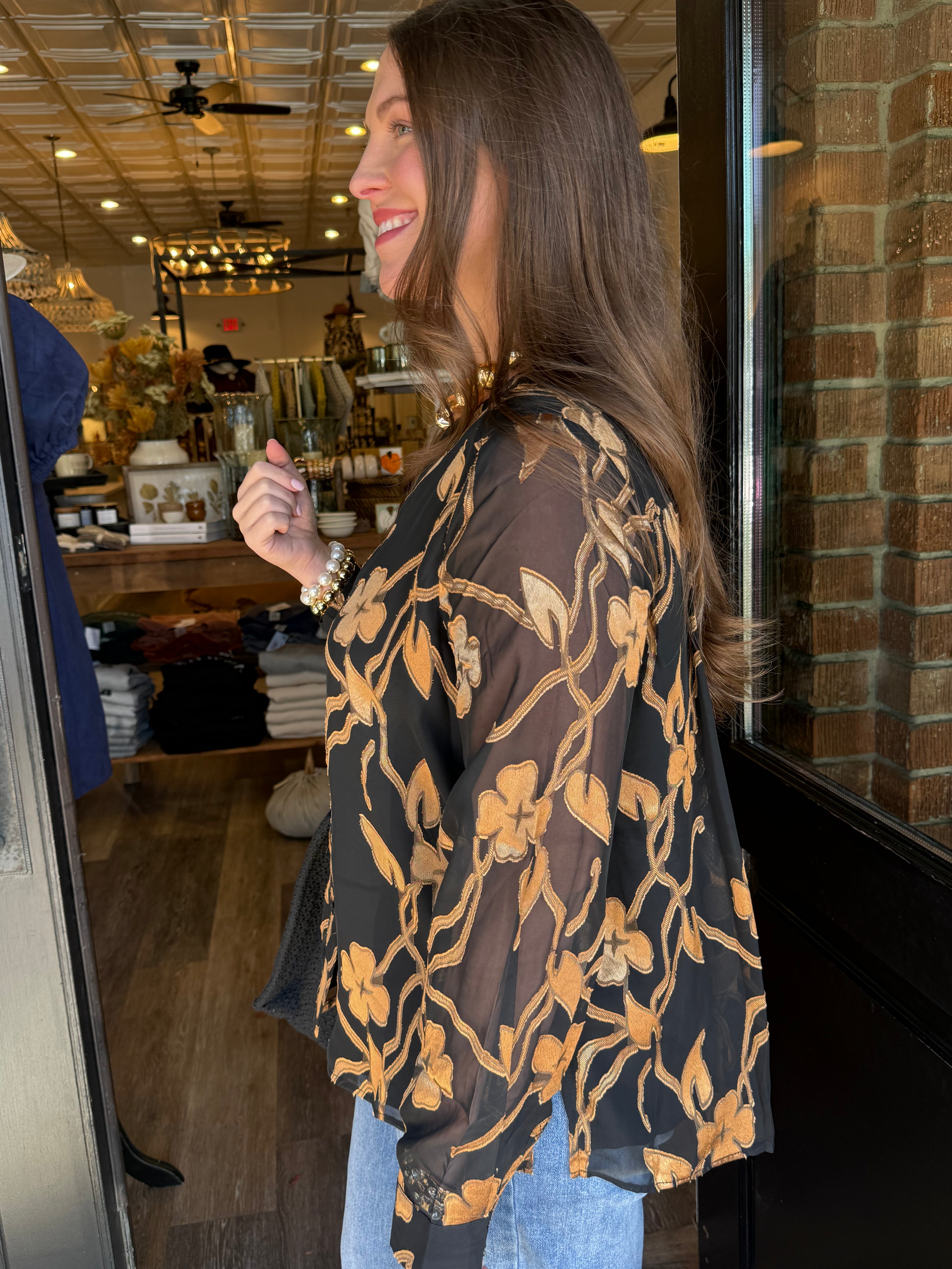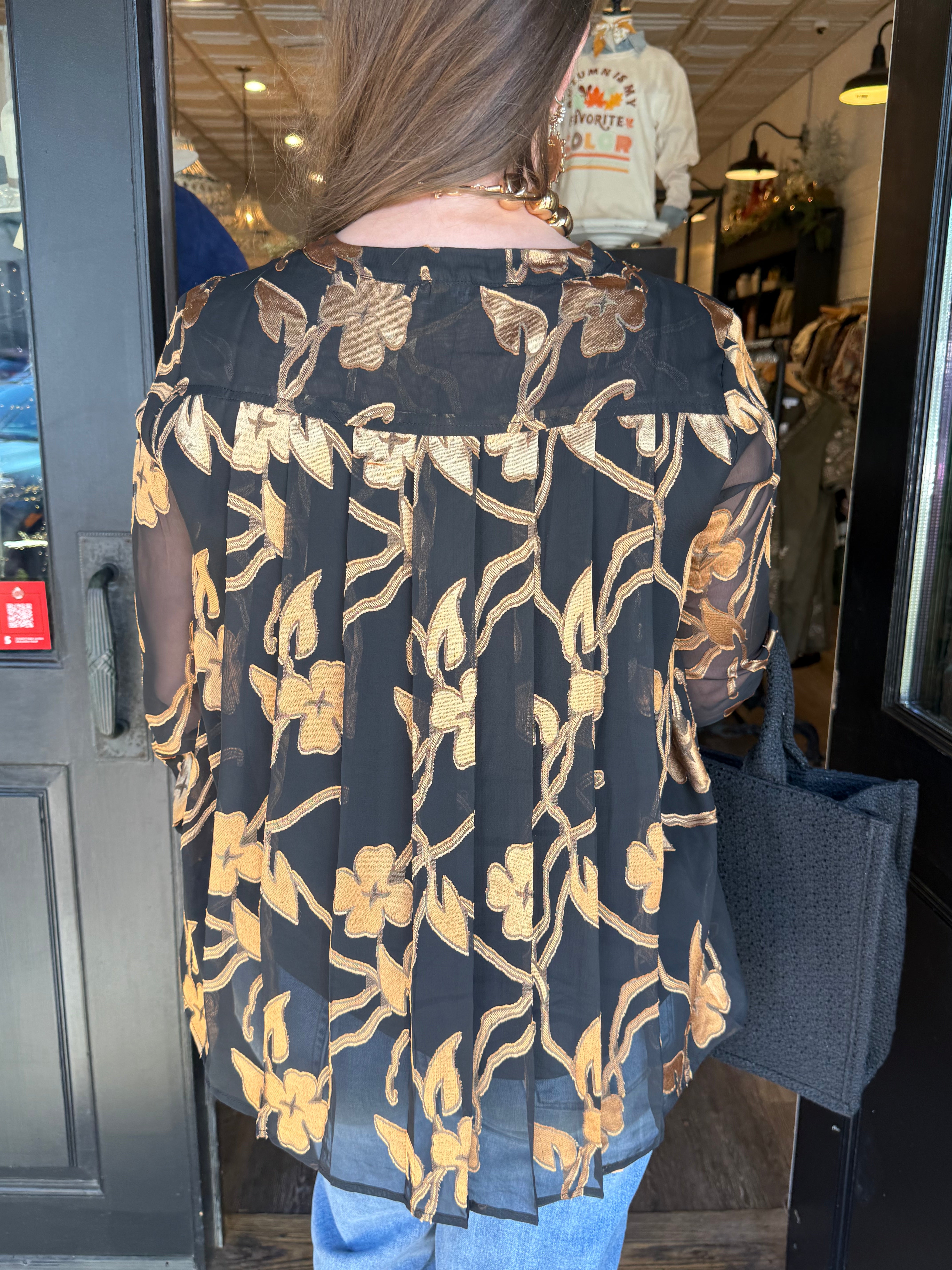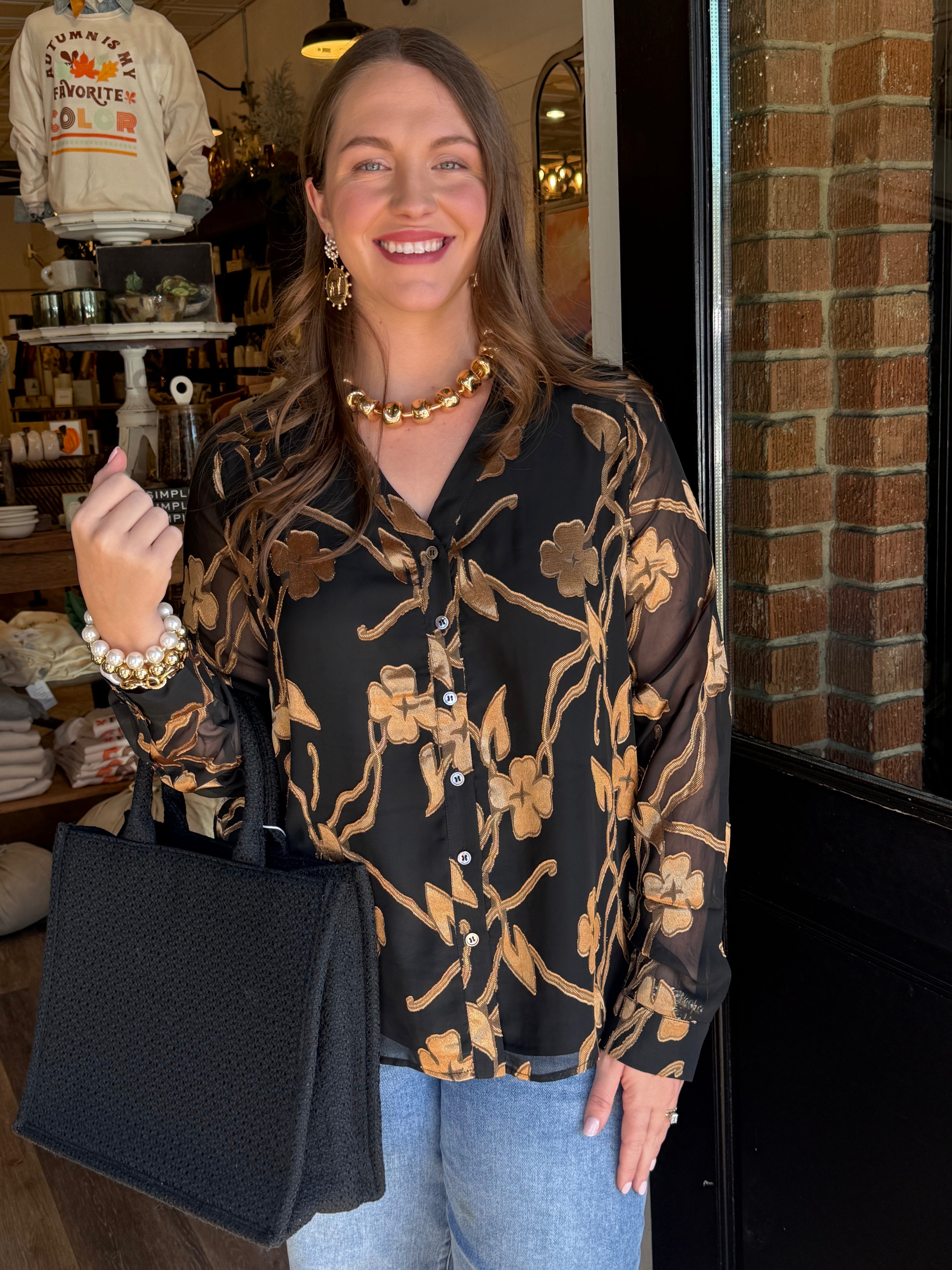 Elegant, effortless, and just the right touch of shine — the Stella Button-Down Blouse is a standout piece for any occasion. Designed with sheer long sleeves, soft lining, and beautiful gold accents throughout, this blouse delivers a polished look with subtle sophistication. Its loose fit keeps it comfortable while the gold detailing adds a boutique-worthy glow.