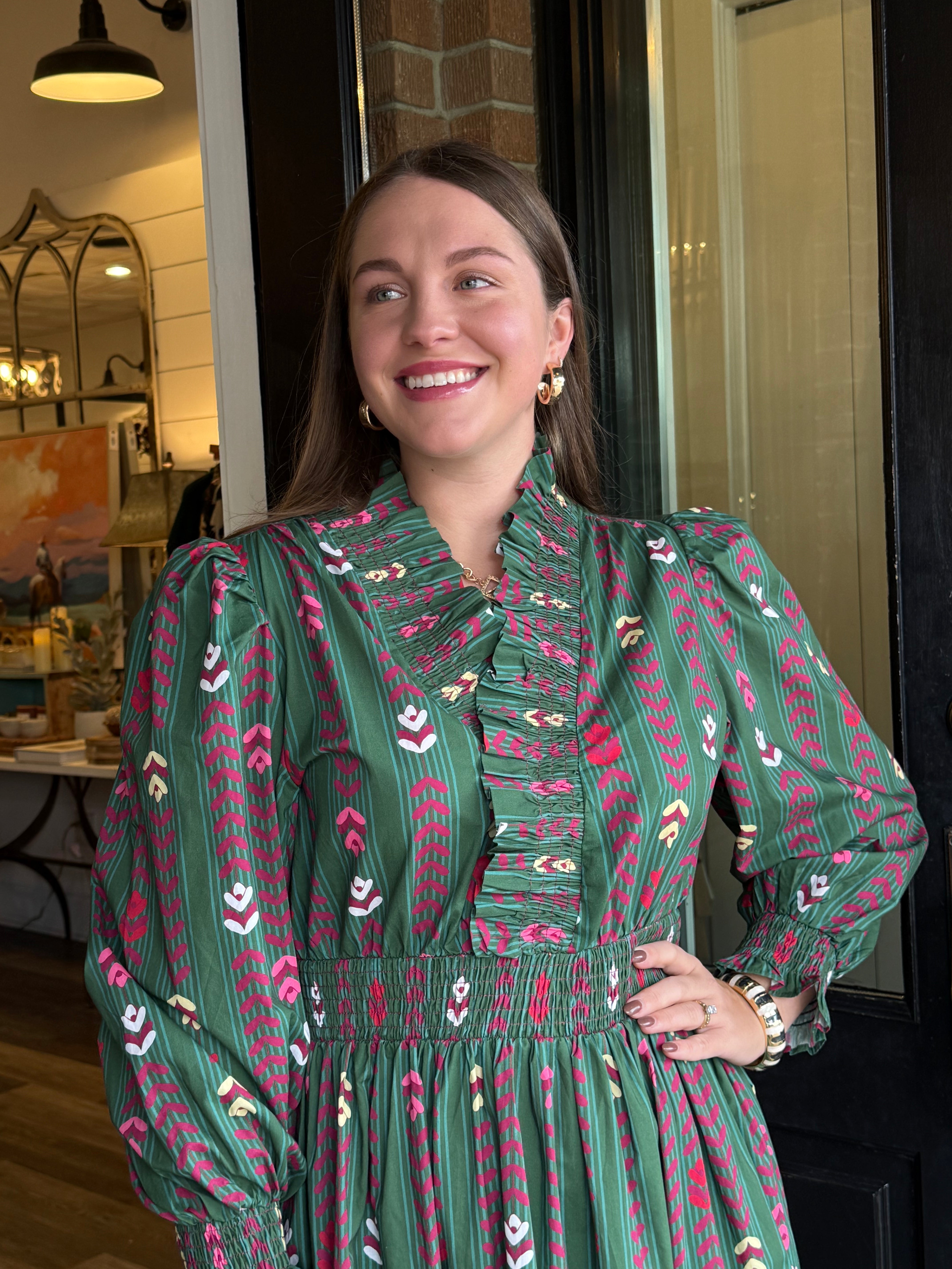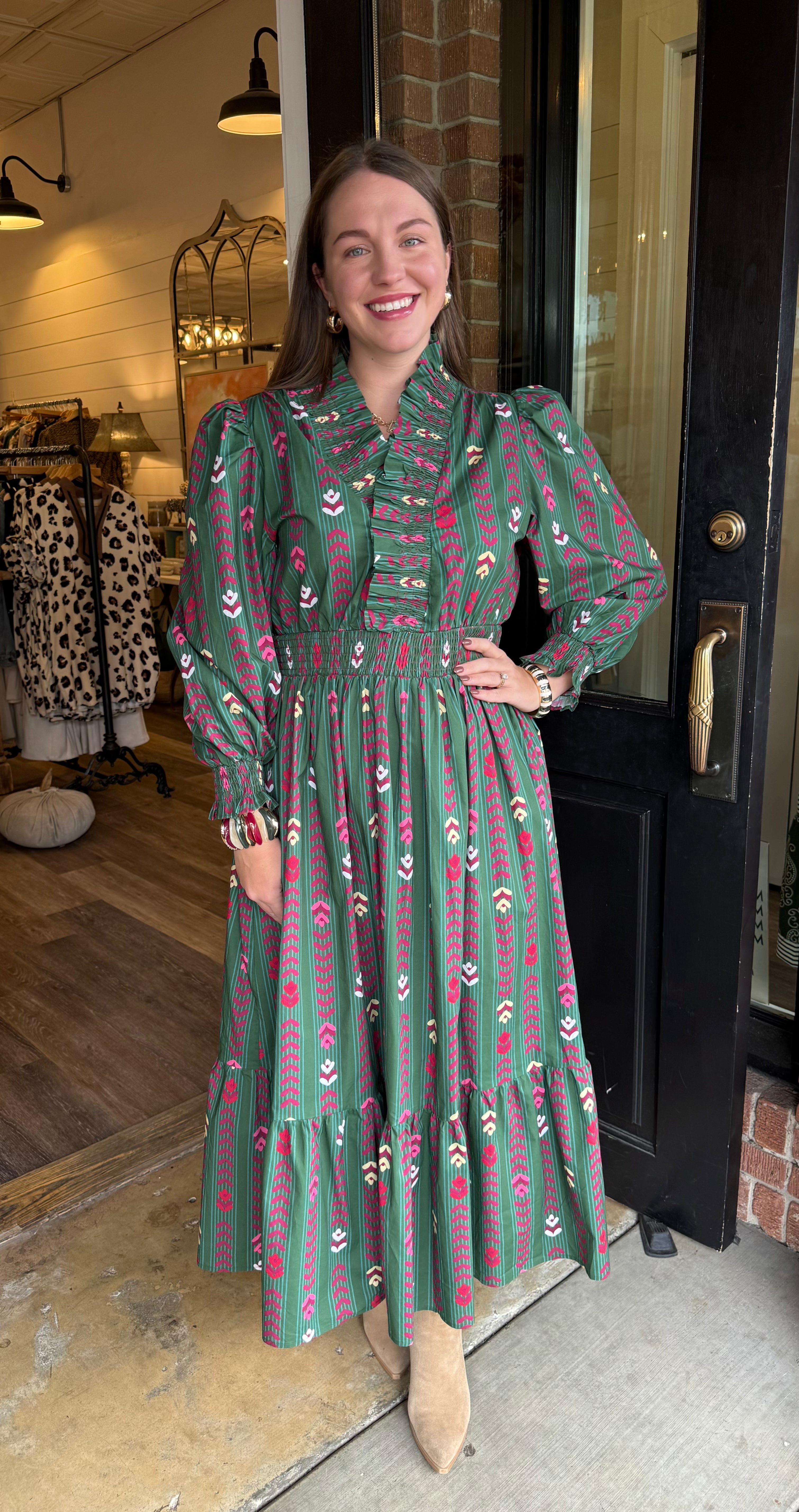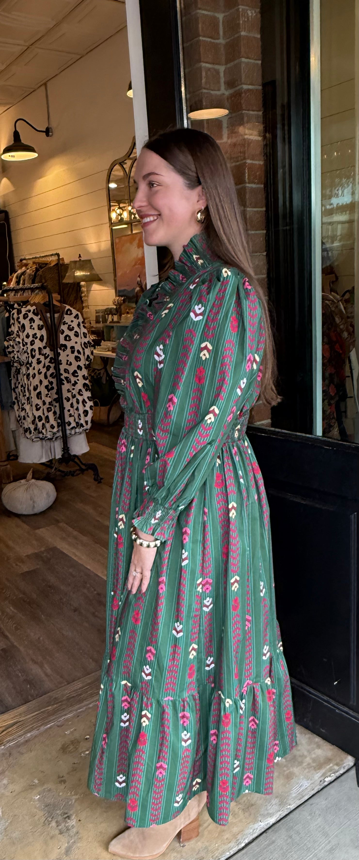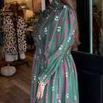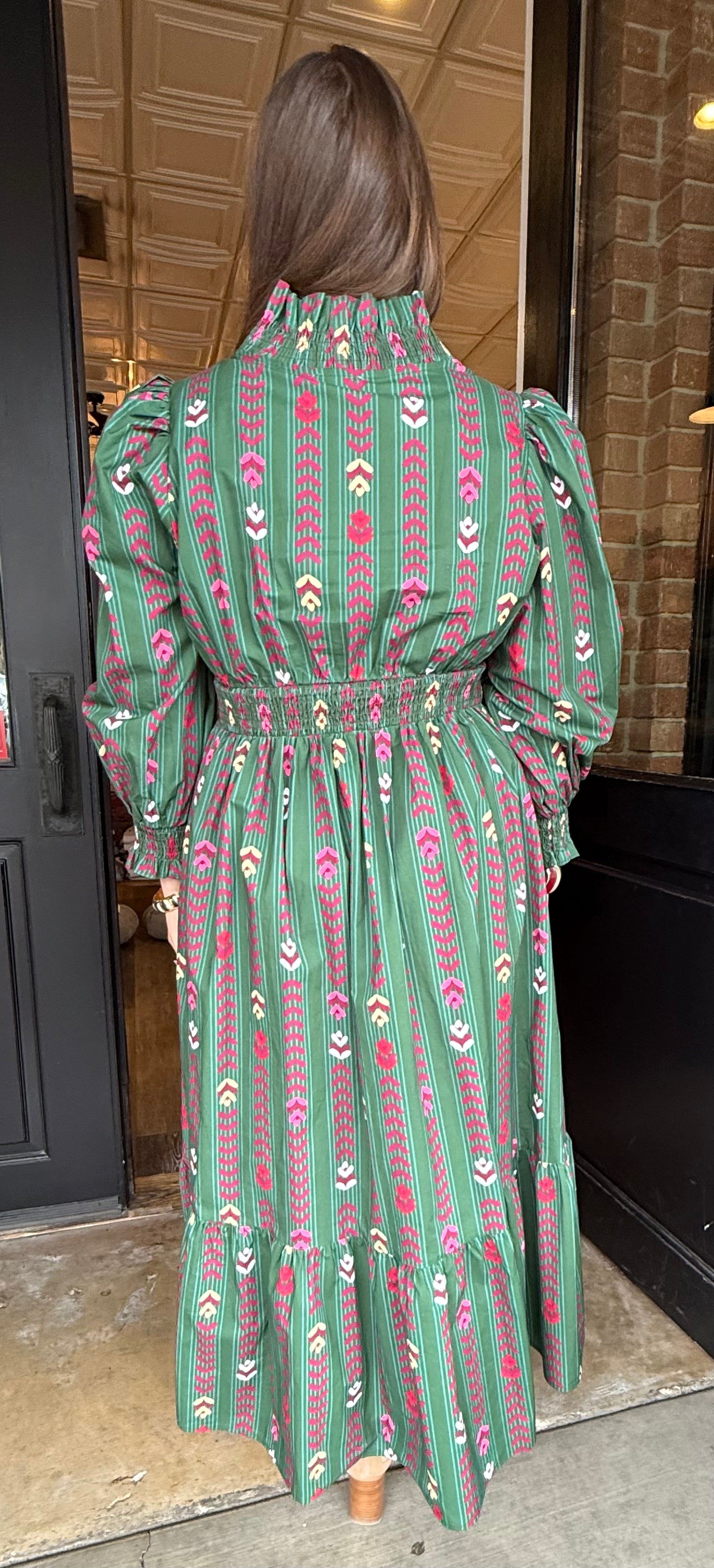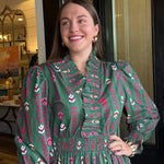 A timeless, feminine silhouette crafted in soft 100% cotton. The Stella Midi Dress features a delicate striped floral print and romantic detailing that makes it perfect for day-to-night wear.