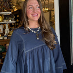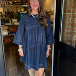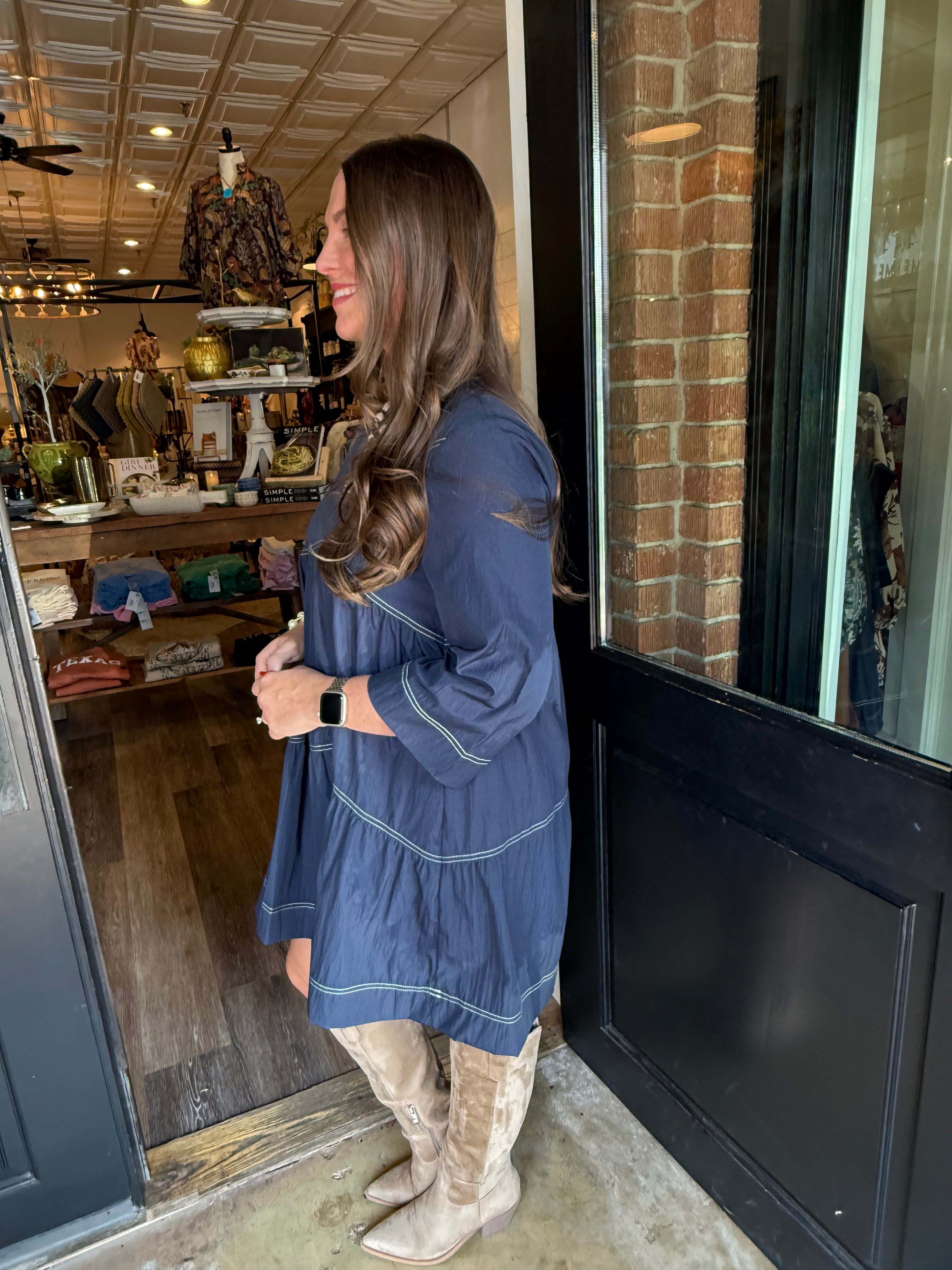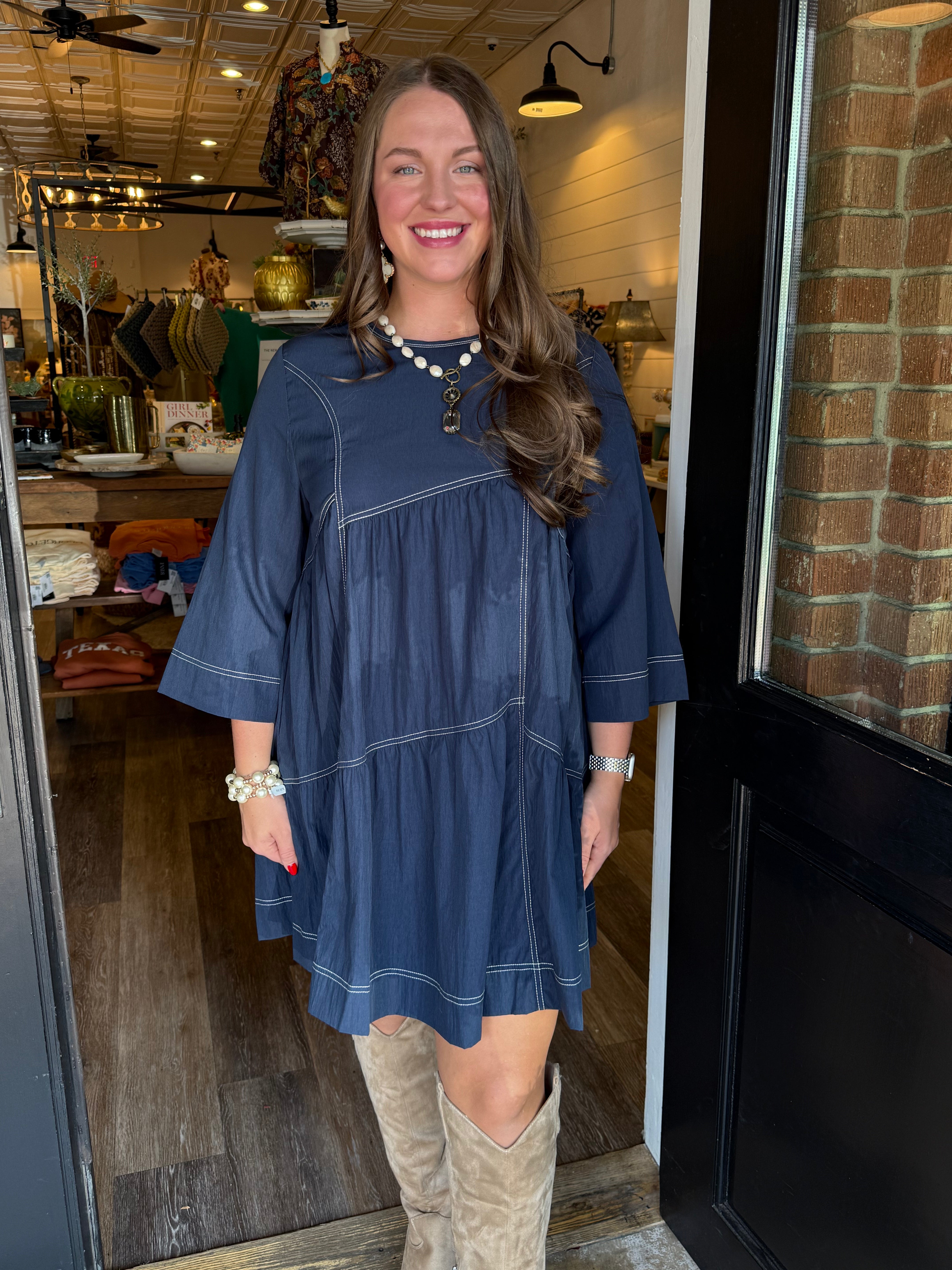 The Tasha Navy Contrast Stitch Dress is a chic mini with tailored details and a flowy fit. Designed with contrast stitching throughout, this piece adds a modern touch to a classic silhouette. Featuring a back neck hook closure, 3/4 length sleeves, and a lightweight drape, it’s perfect for day-to-night wear. The polyester-nylon blend ensures comfort while keeping its shape.