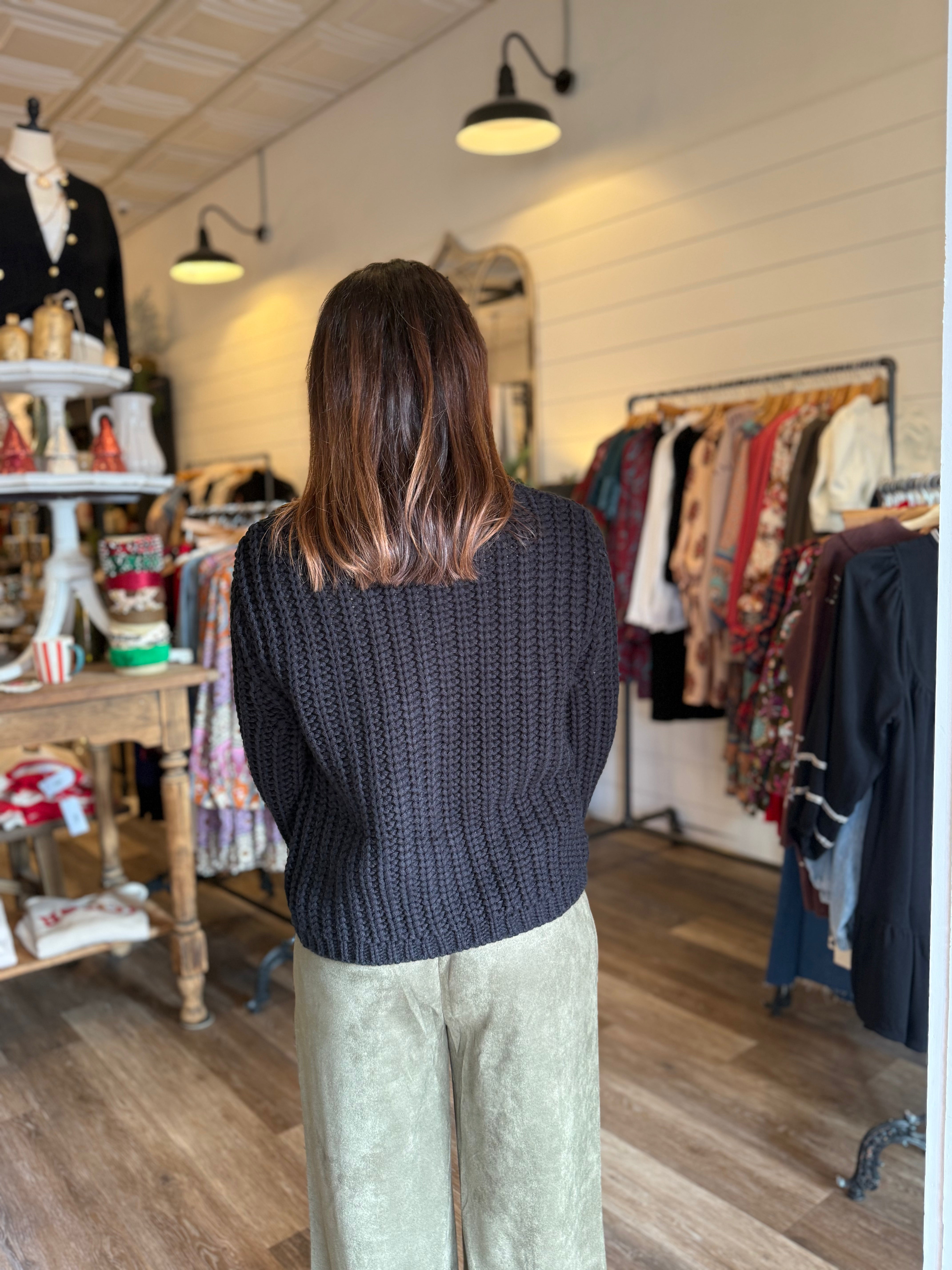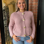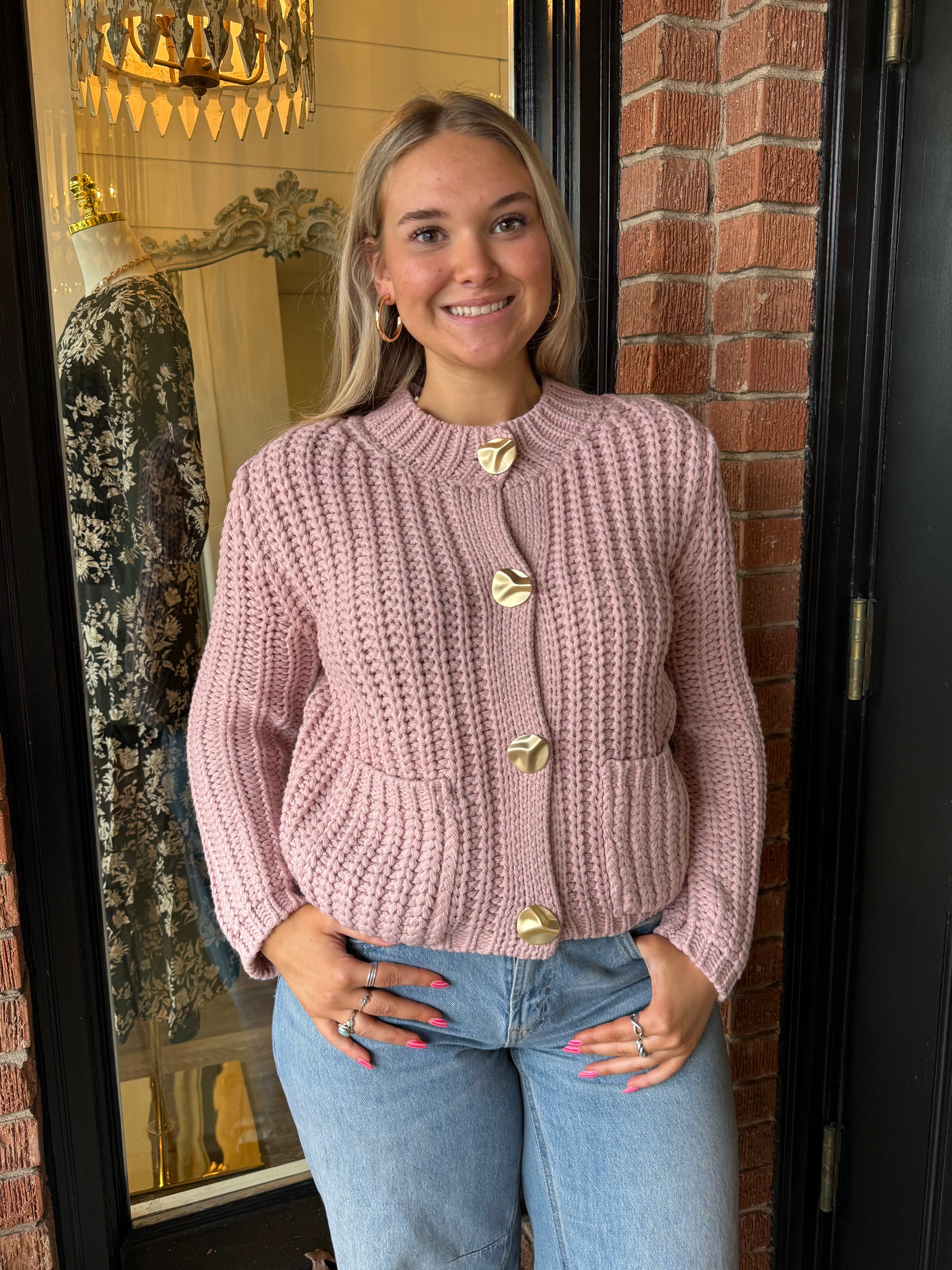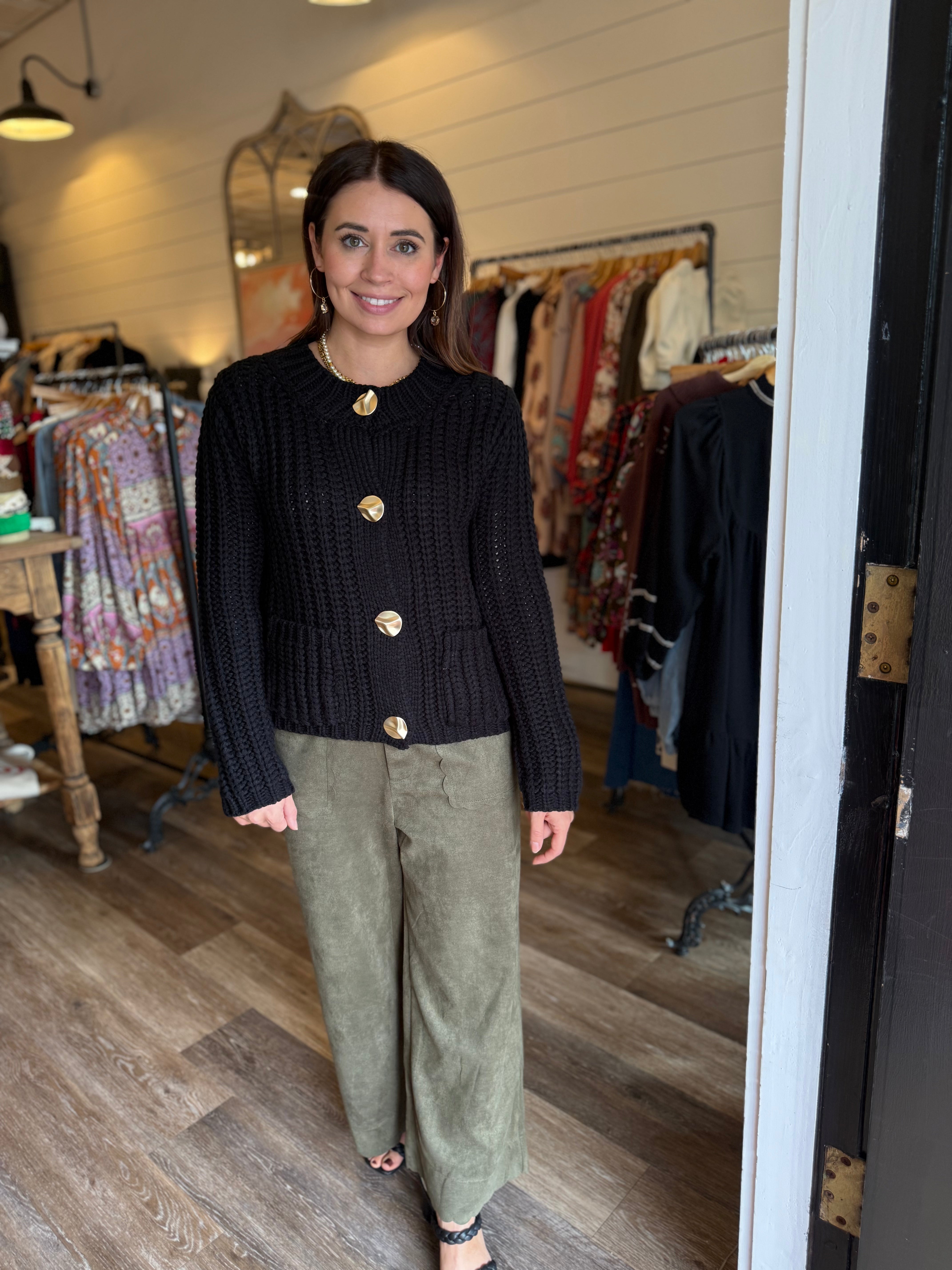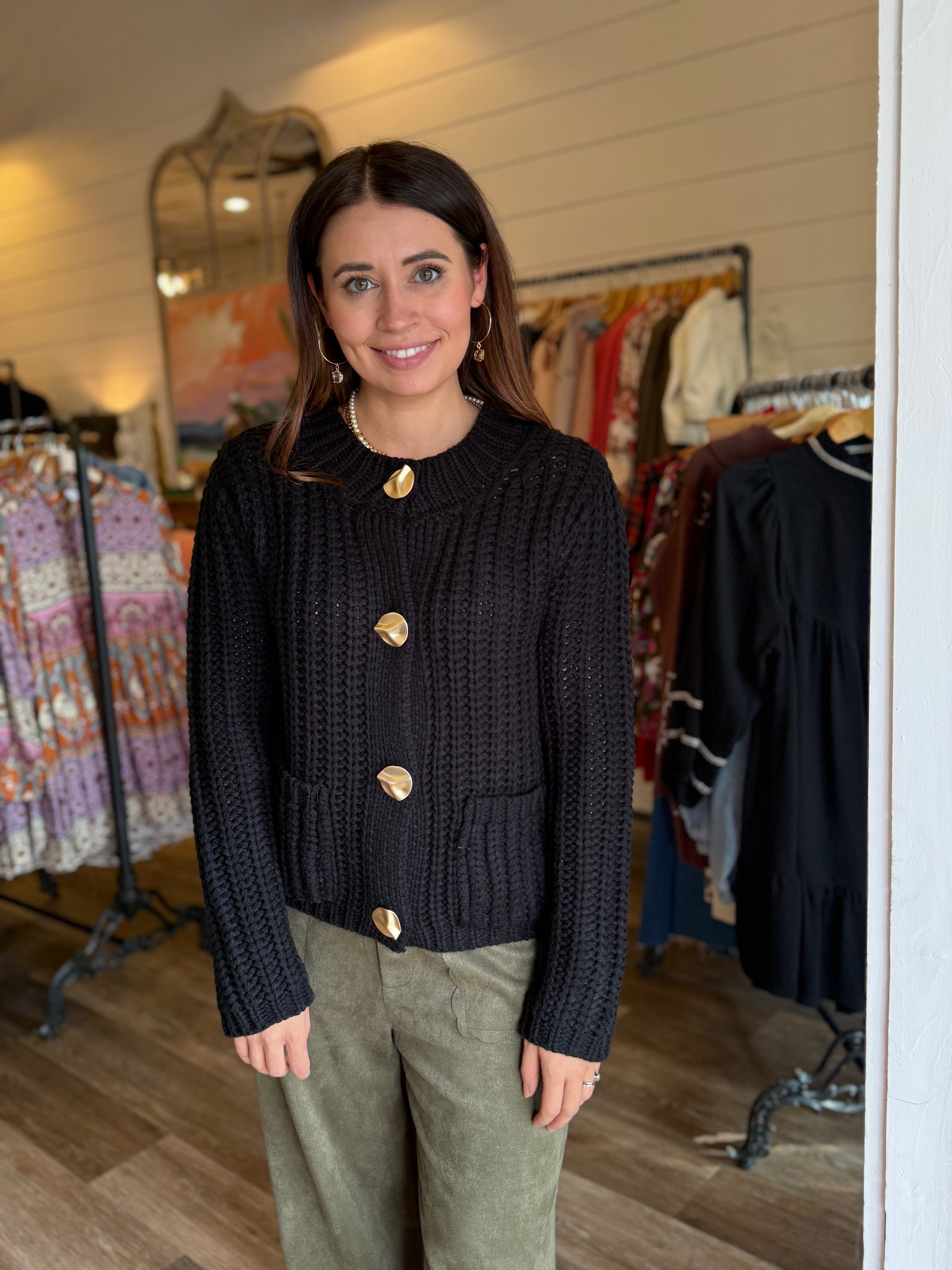 Add texture and charm to your layering game with this chunky knit cardigan. Featuring sculptural gold statement buttons and cozy patch pockets, it’s the perfect throw-on piece for pairing with skirts, dresses, or denim in any fall wardrobe. Soft, warm, and beautifully structured, this cardigan gives you effortless style with a touch of luxe.