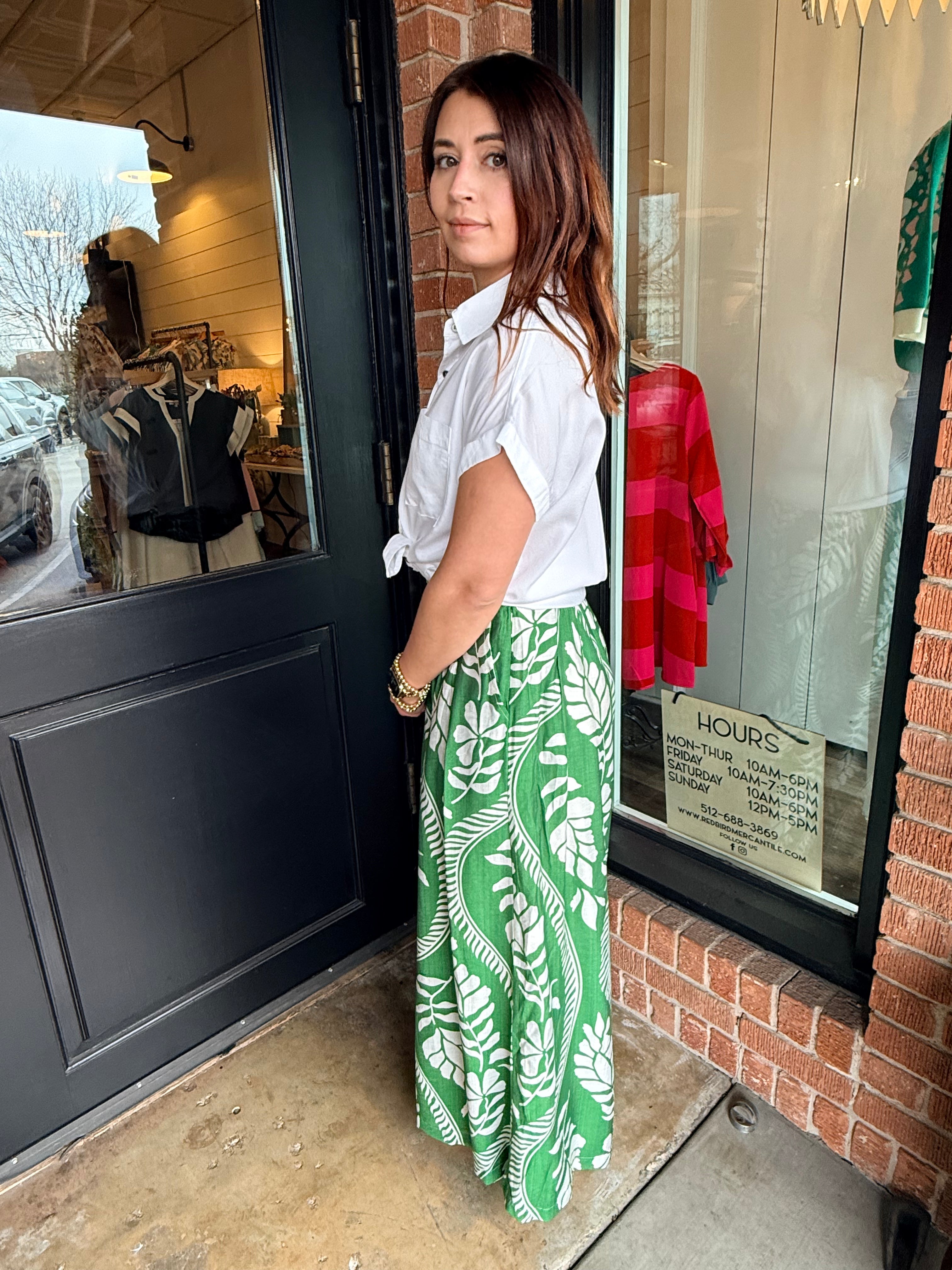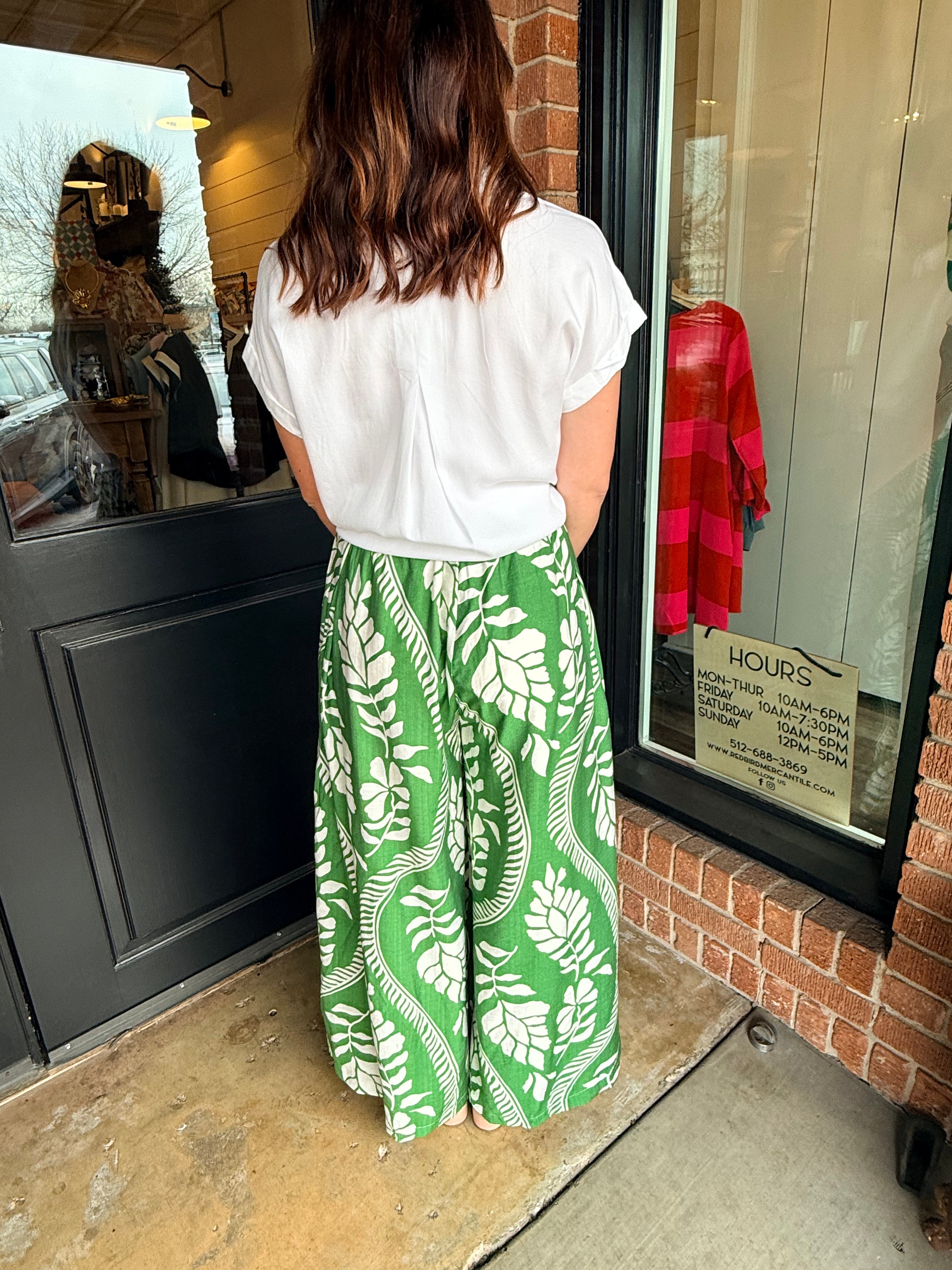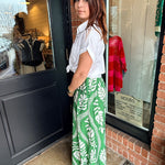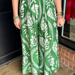 Flowy, comfortable, and full of personality, the Taylor Tropical Leaf Print Wide Leg Pants are made for warm days and effortless styling. Featuring a bold tropical leaf ogee print, these pants offer a relaxed wide-leg silhouette with an elastic waistband for all-day comfort. Side pockets add functionality, while the built-in shorts lining provides coverage without sacrificing movement.