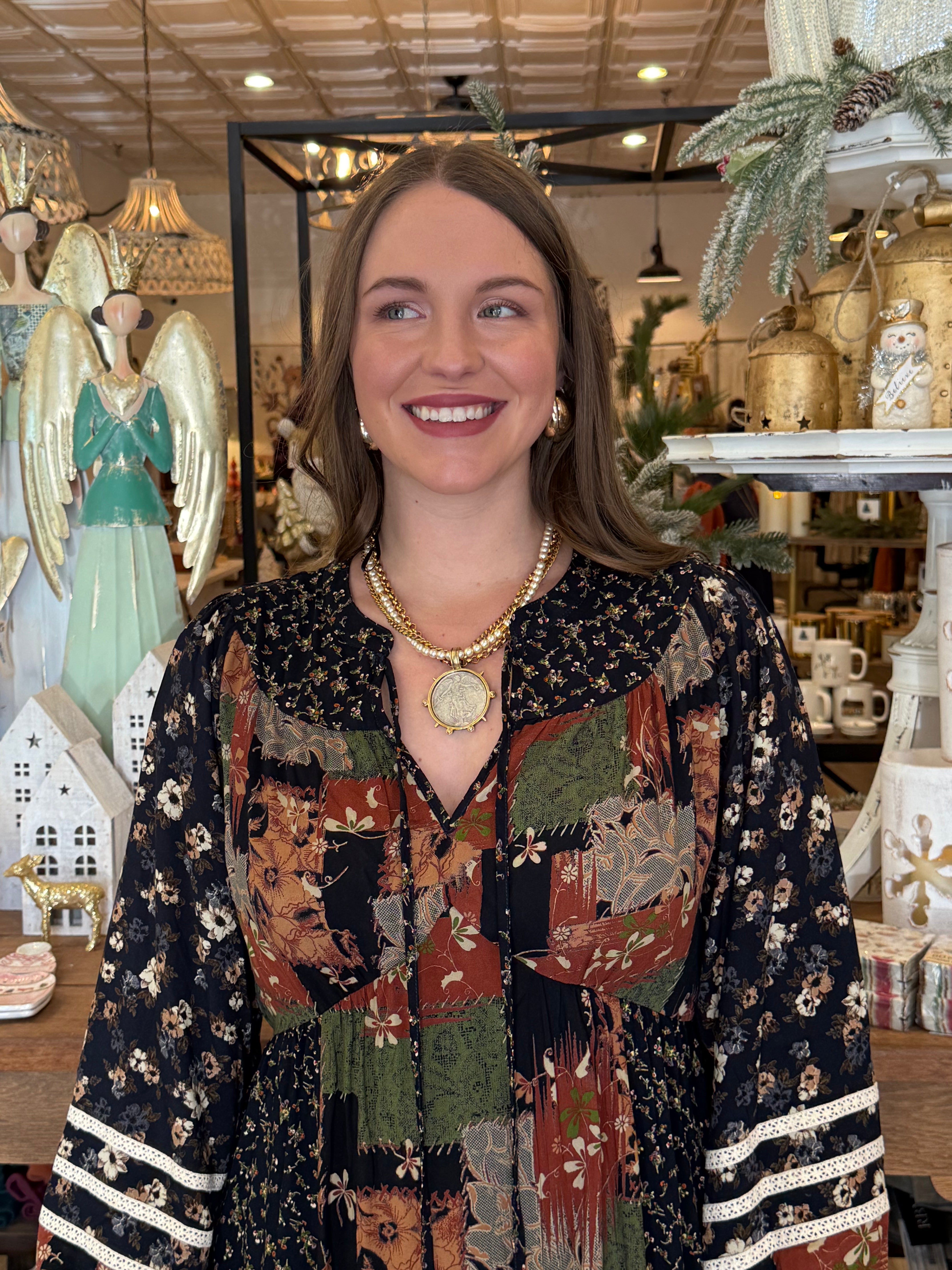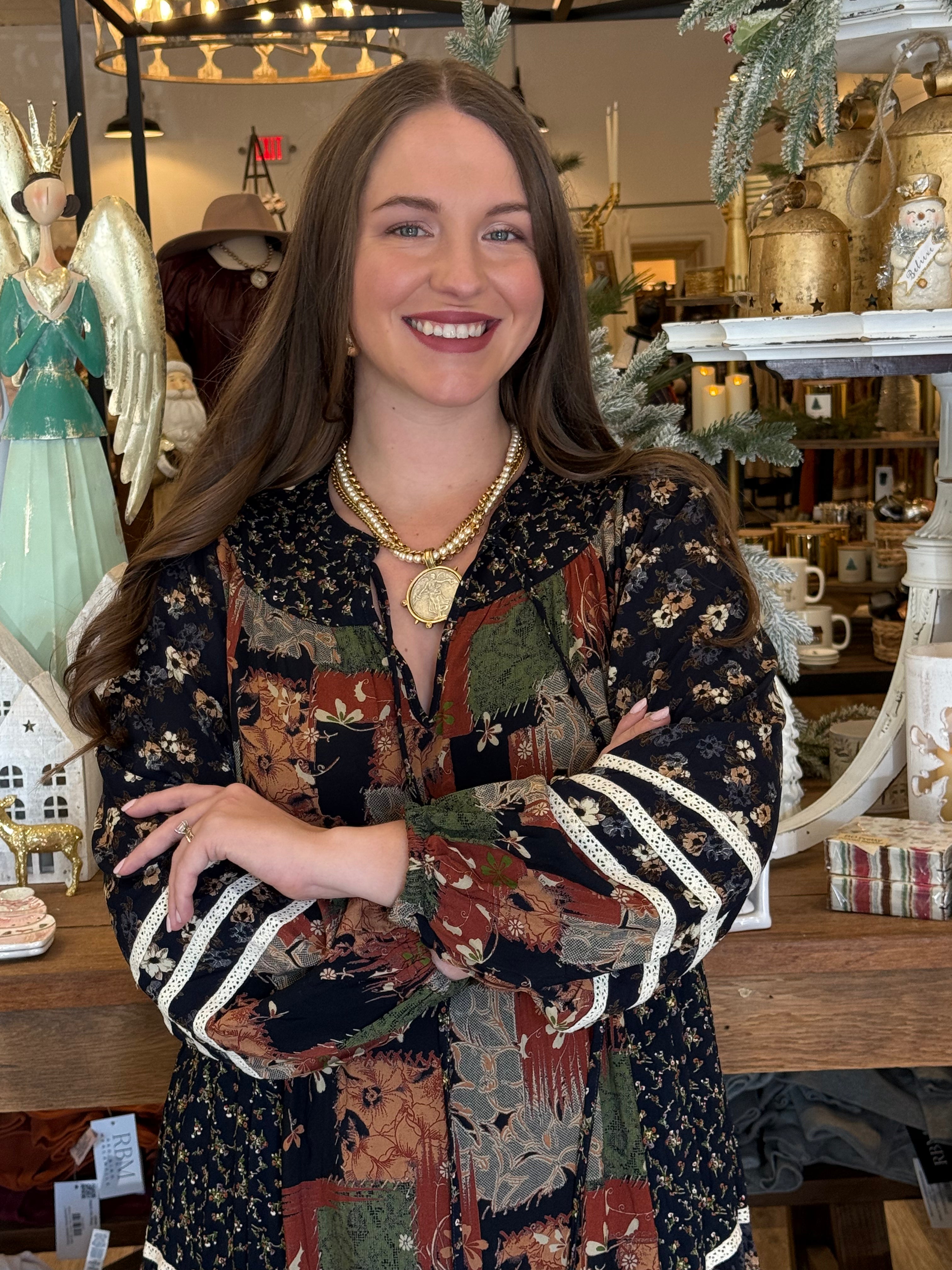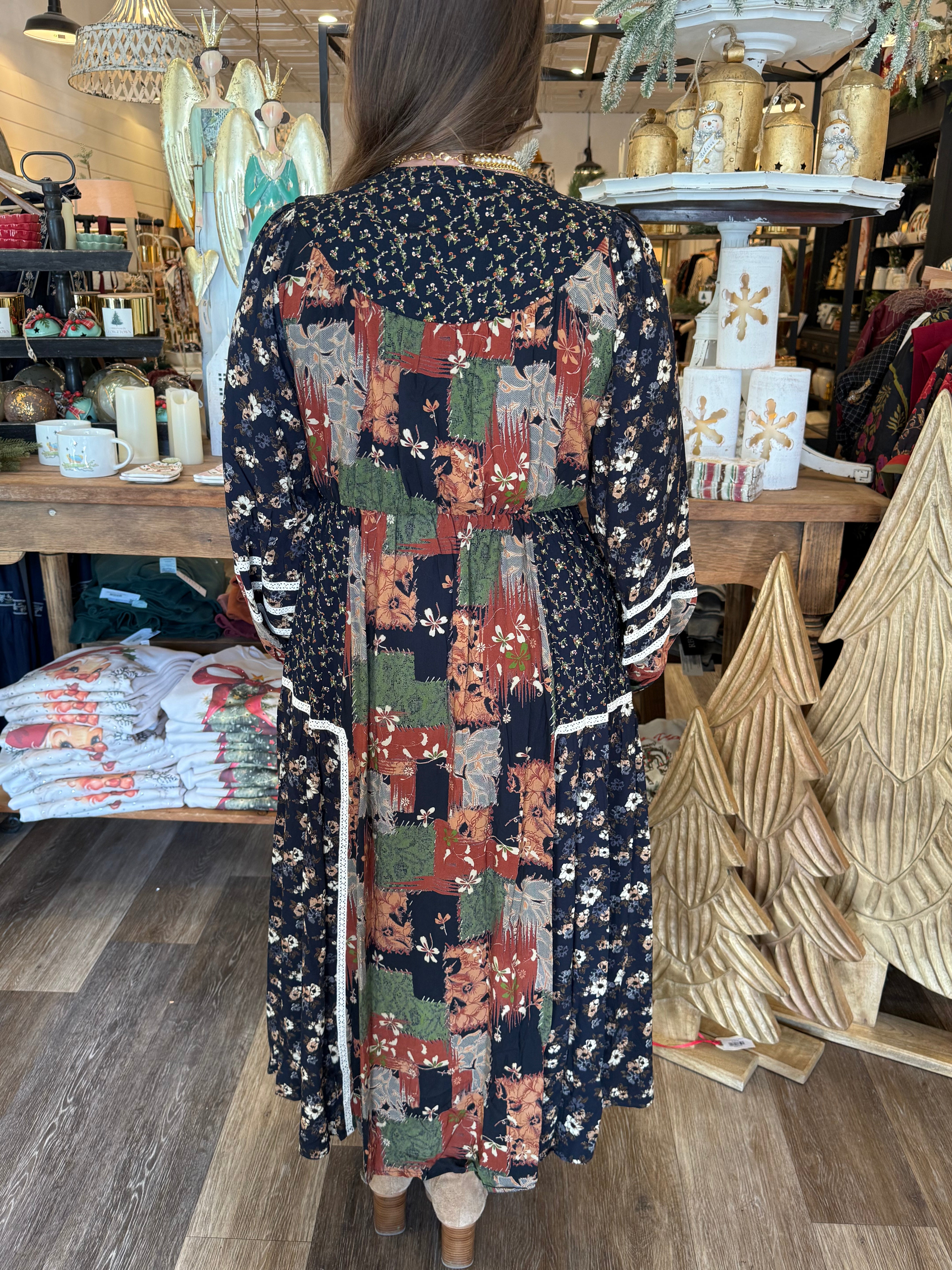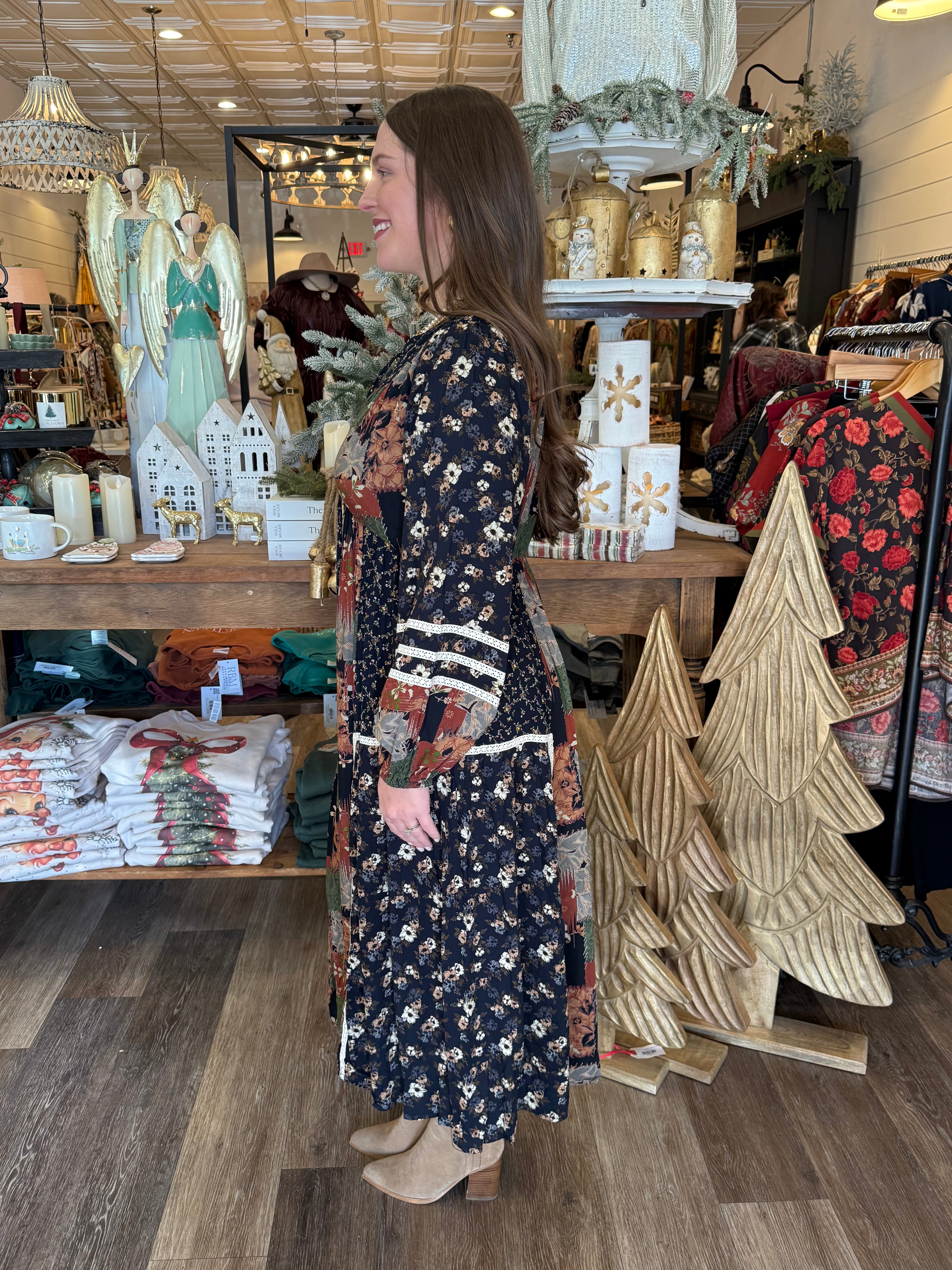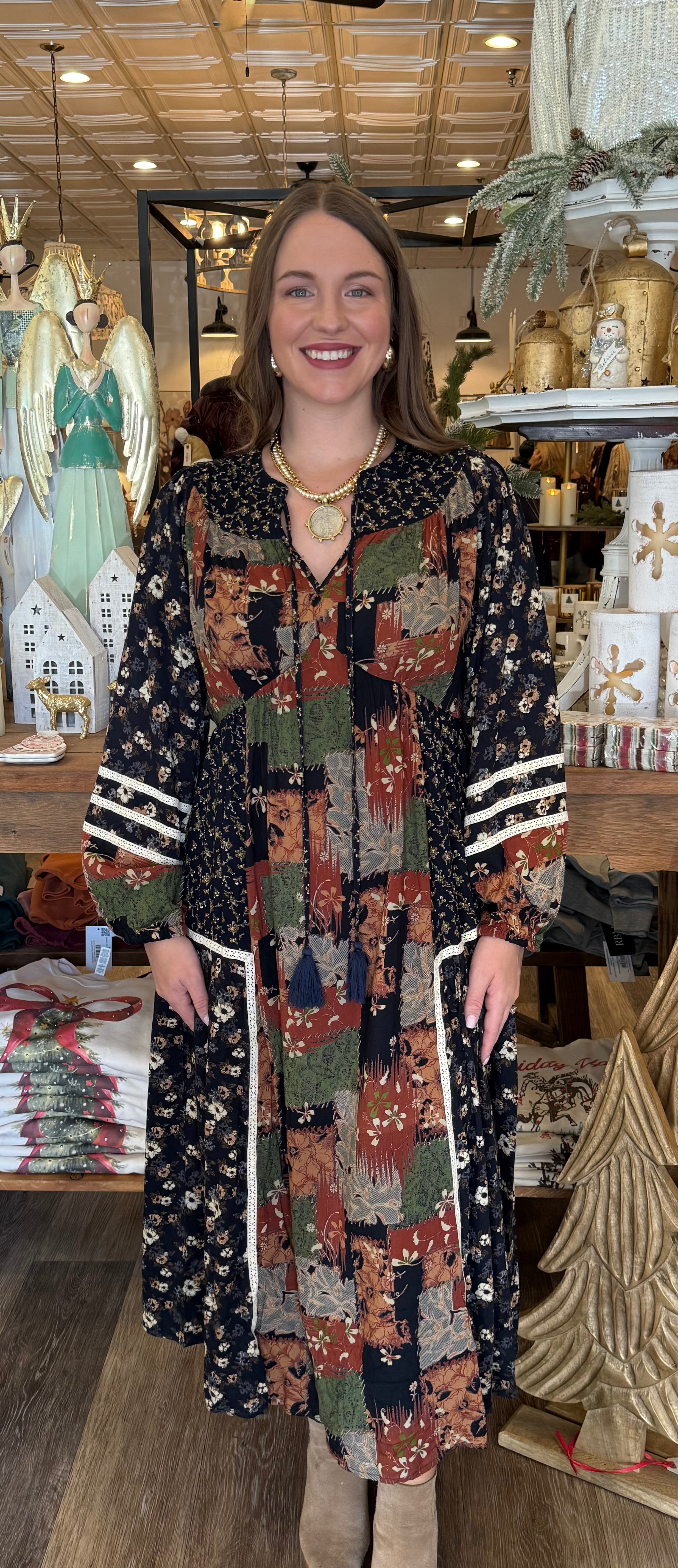 Romantic, detailed, and full of charm — the Teresa Mixed Floral Patchwork Midi Dress is the ultimate boutique favorite for the season. Featuring a high ruffled neckline, notched V with tassel ties, and beautiful lace trim details, this dress combines soft femininity with effortless wearability. The elastic waist and cuffs create a flattering, comfortable fit, while the tiered patchwork floral print gives it that one-of-a-kind, heirloom-inspired look.