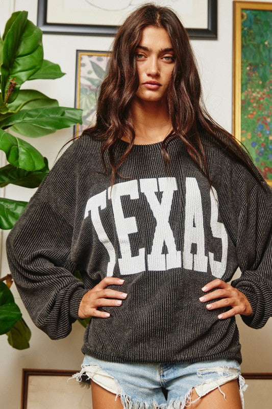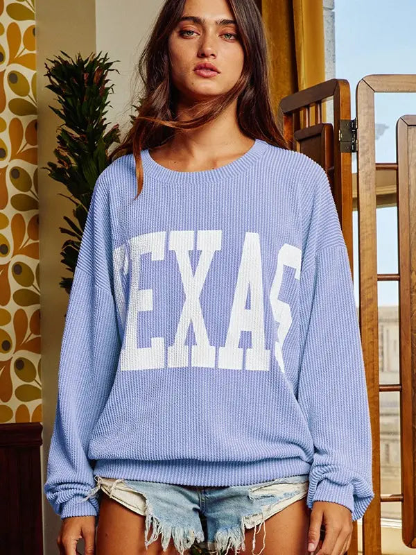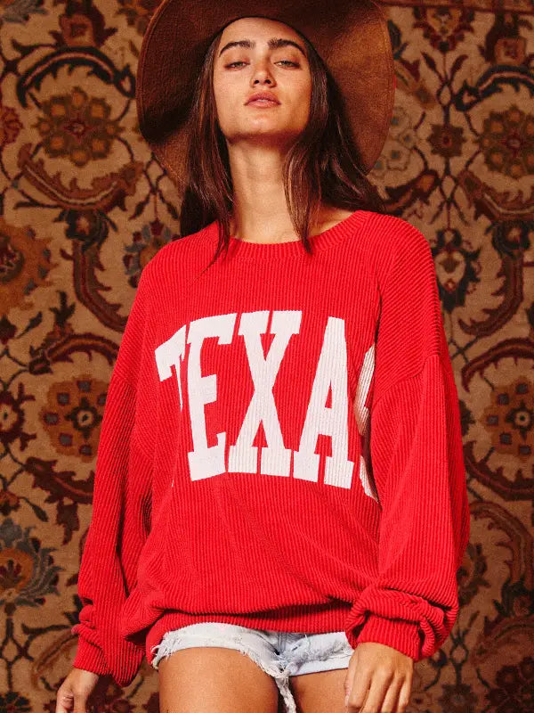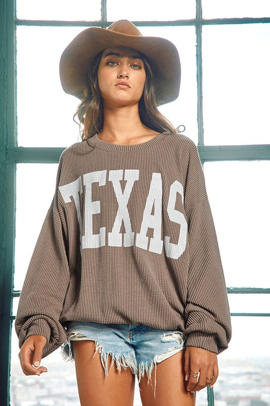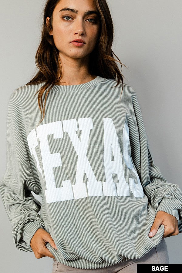 Stay warm and stylish with our Texas Ribbed Sweatshirt. This oversized and super soft sweatshirt features ribbing for added texture. Perfect for those cool Texas nights or lounging around the house.
