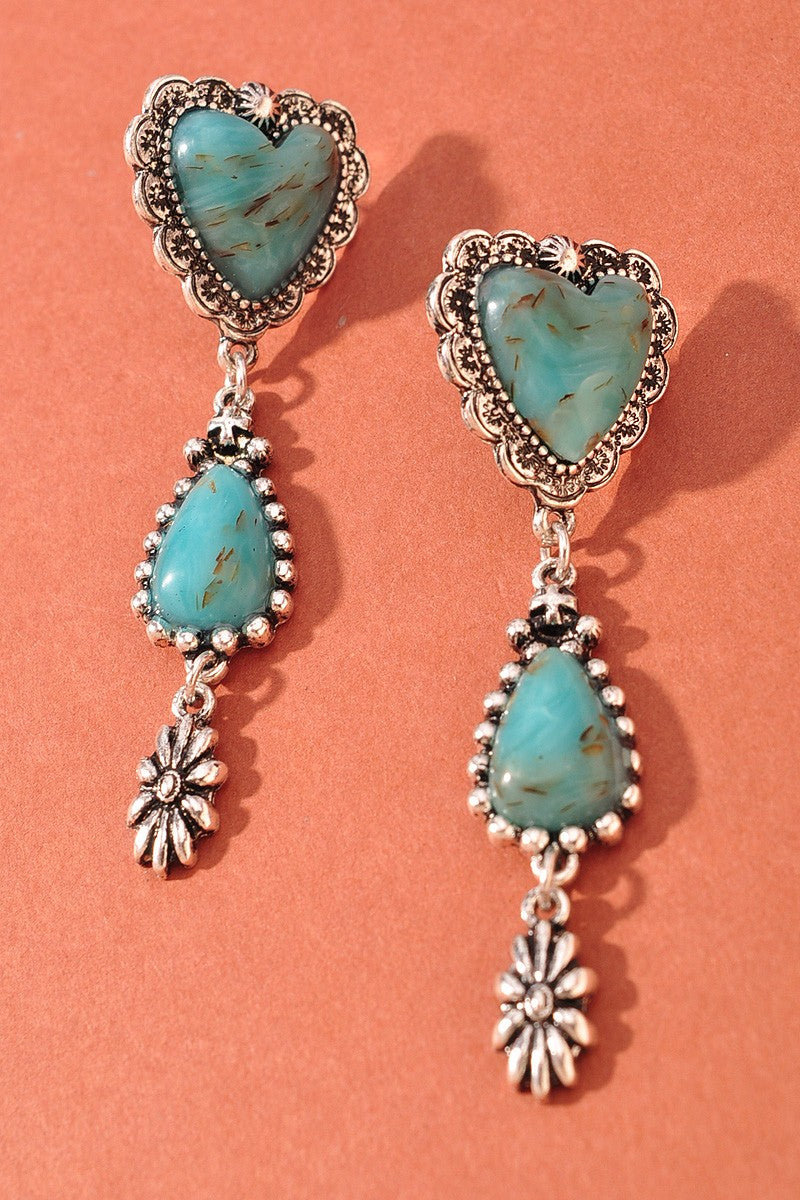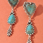 Bold, beautiful, and full of western charm. These Western Turquoise Heart & Teardrop Dangle Earrings feature a vibrant turquoise heart paired with an elongated teardrop accent, finished with antique-inspired metal detailing for a true Southwestern feel. The cascading design creates gorgeous movement and makes them an instant statement piece.