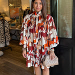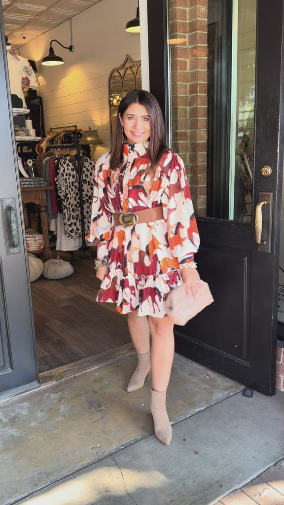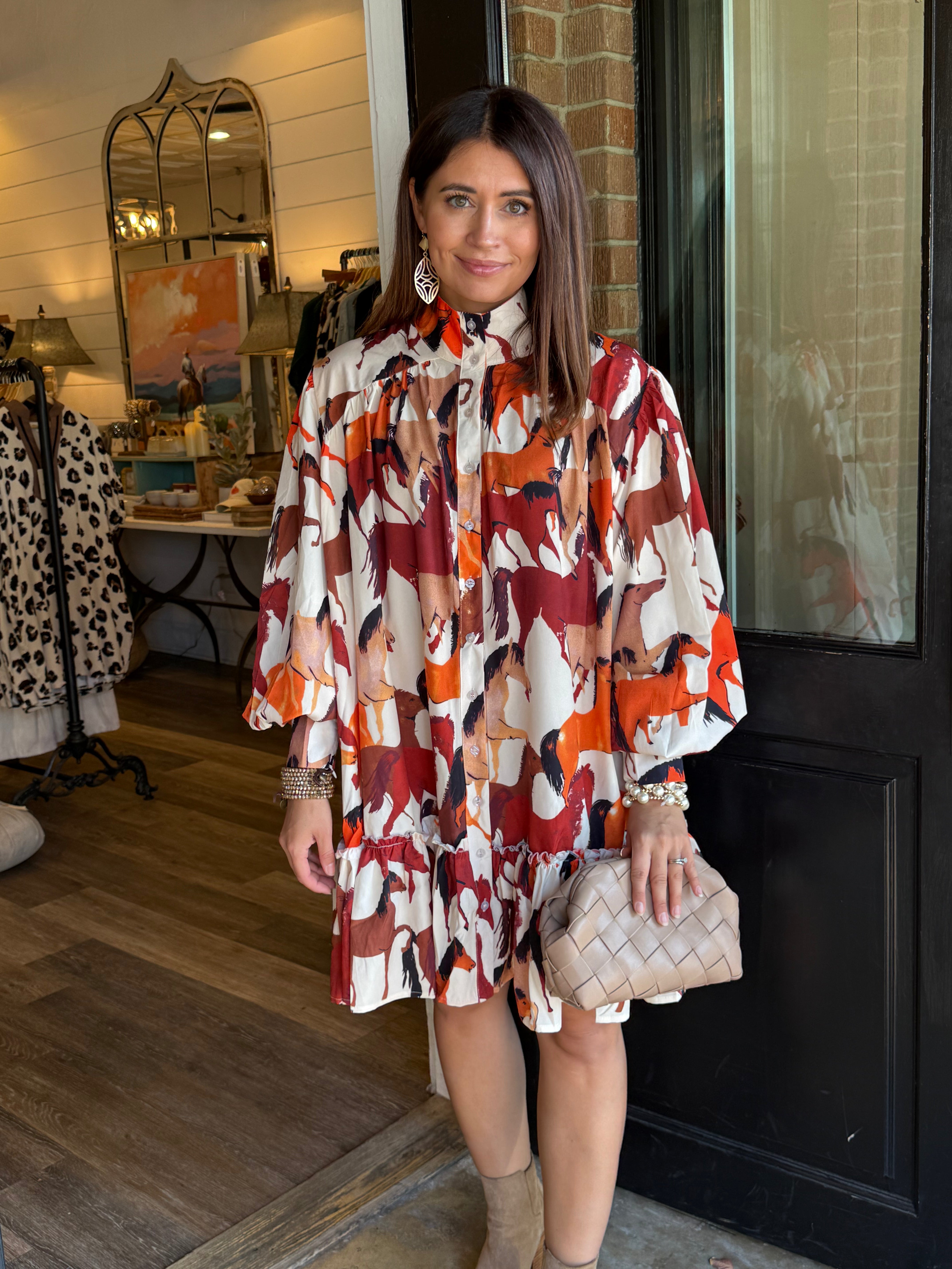 Classic charm meets effortless fall style in the Tyler Horse Dress. Designed with a subtle horse print that captures the season’s equestrian inspiration, this flowy button-down dress features a high neckline, long sleeves, and a tiered hem for graceful movement. The soft cotton-blend fabric keeps it comfortable for all-day wear — perfect for workdays, fall outings, or weekend brunch.