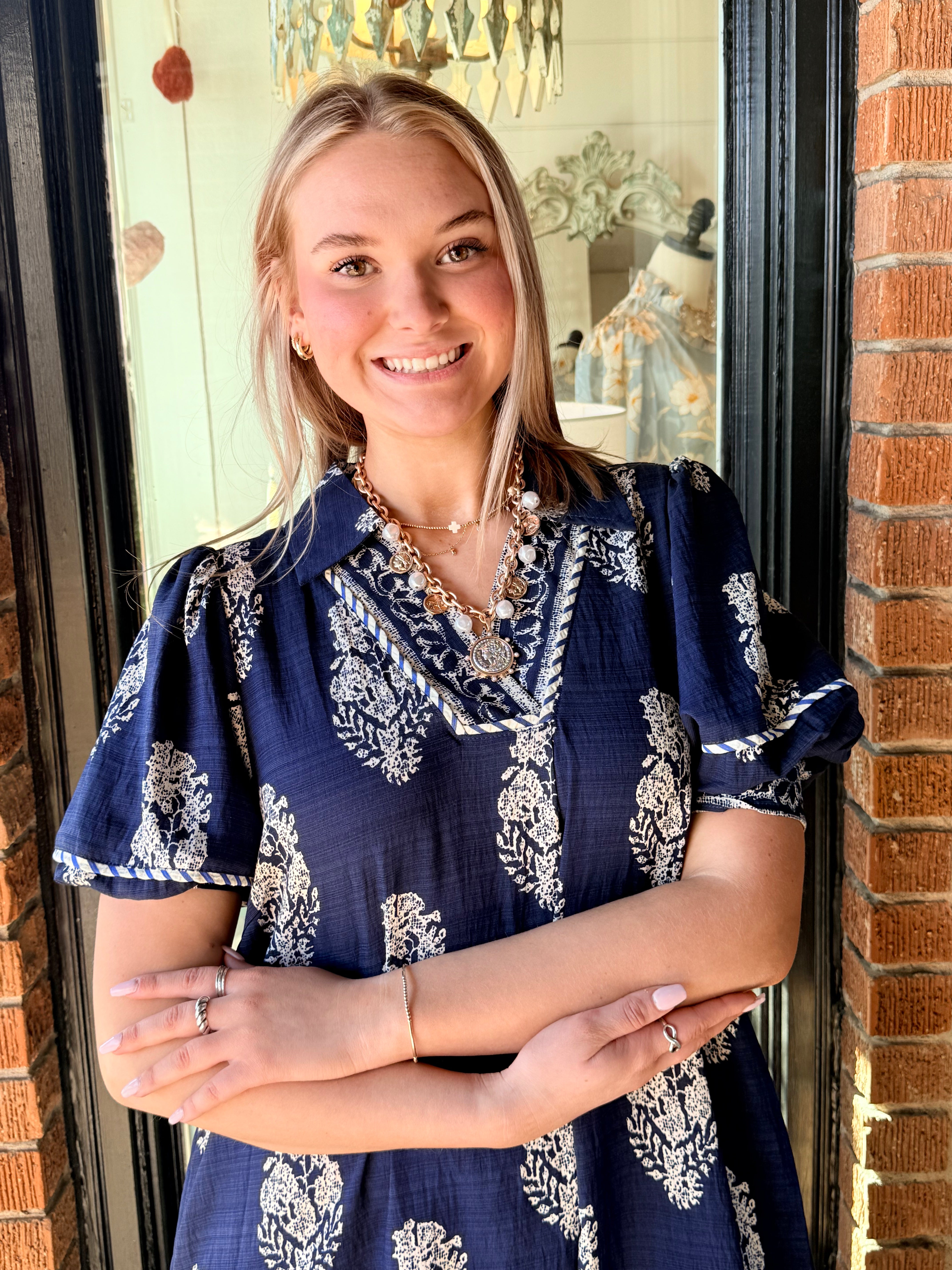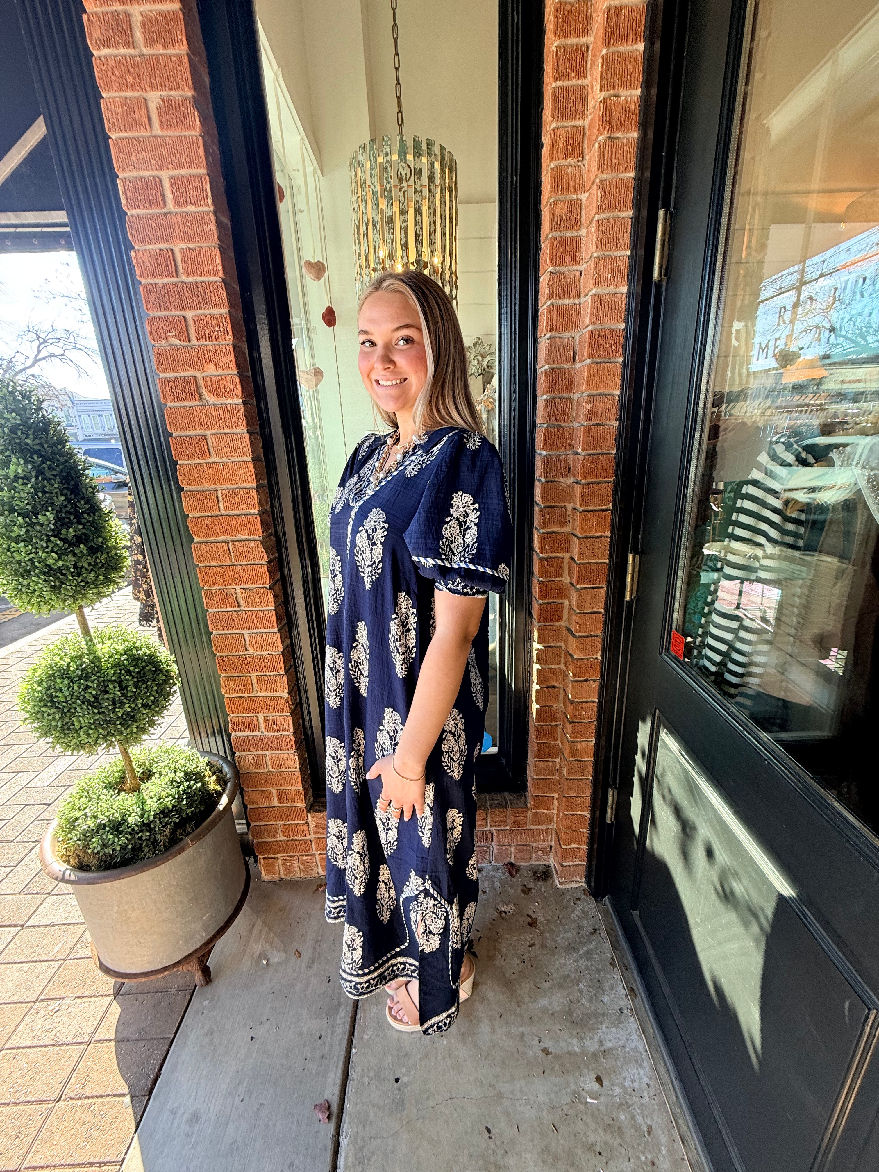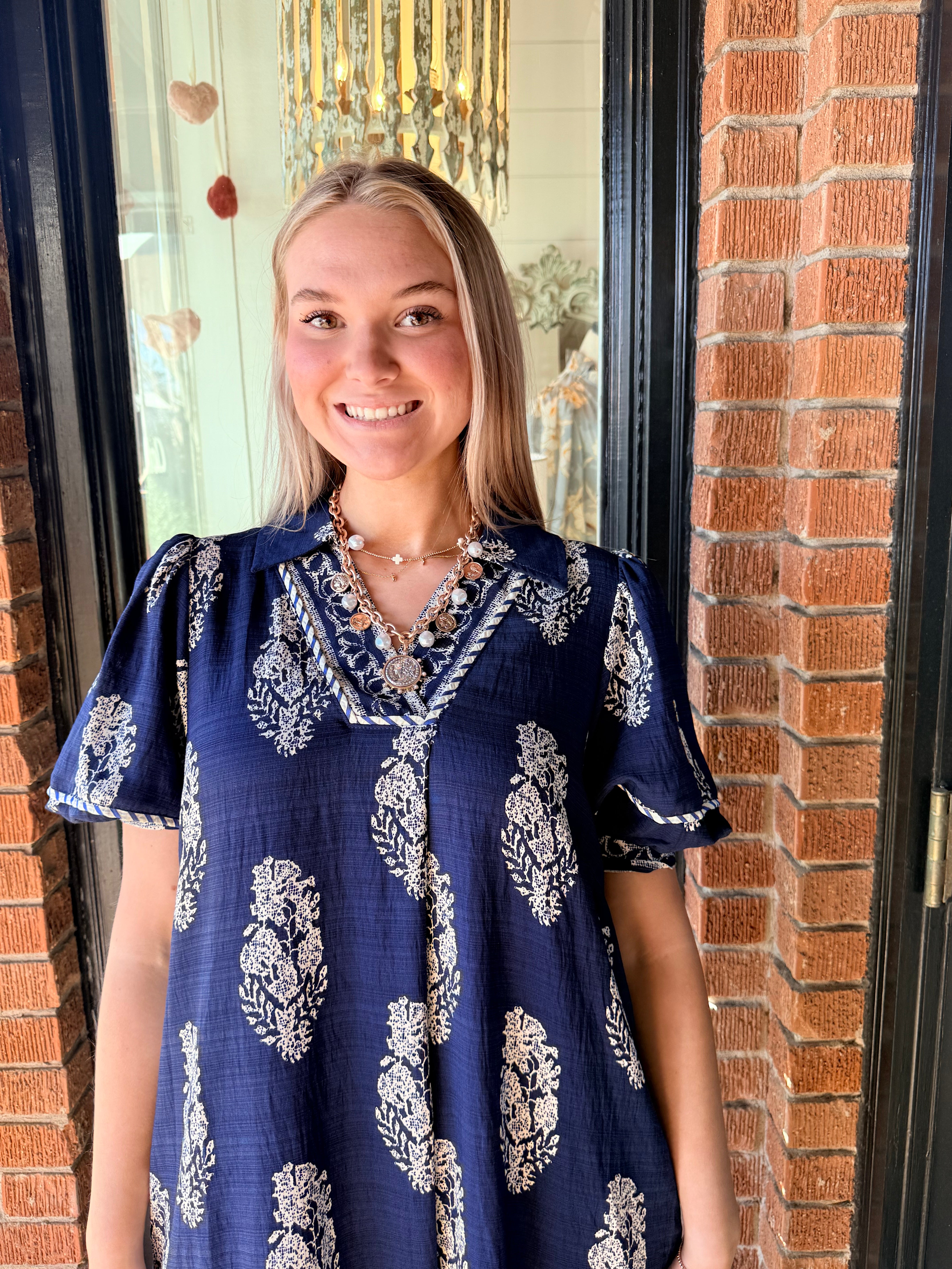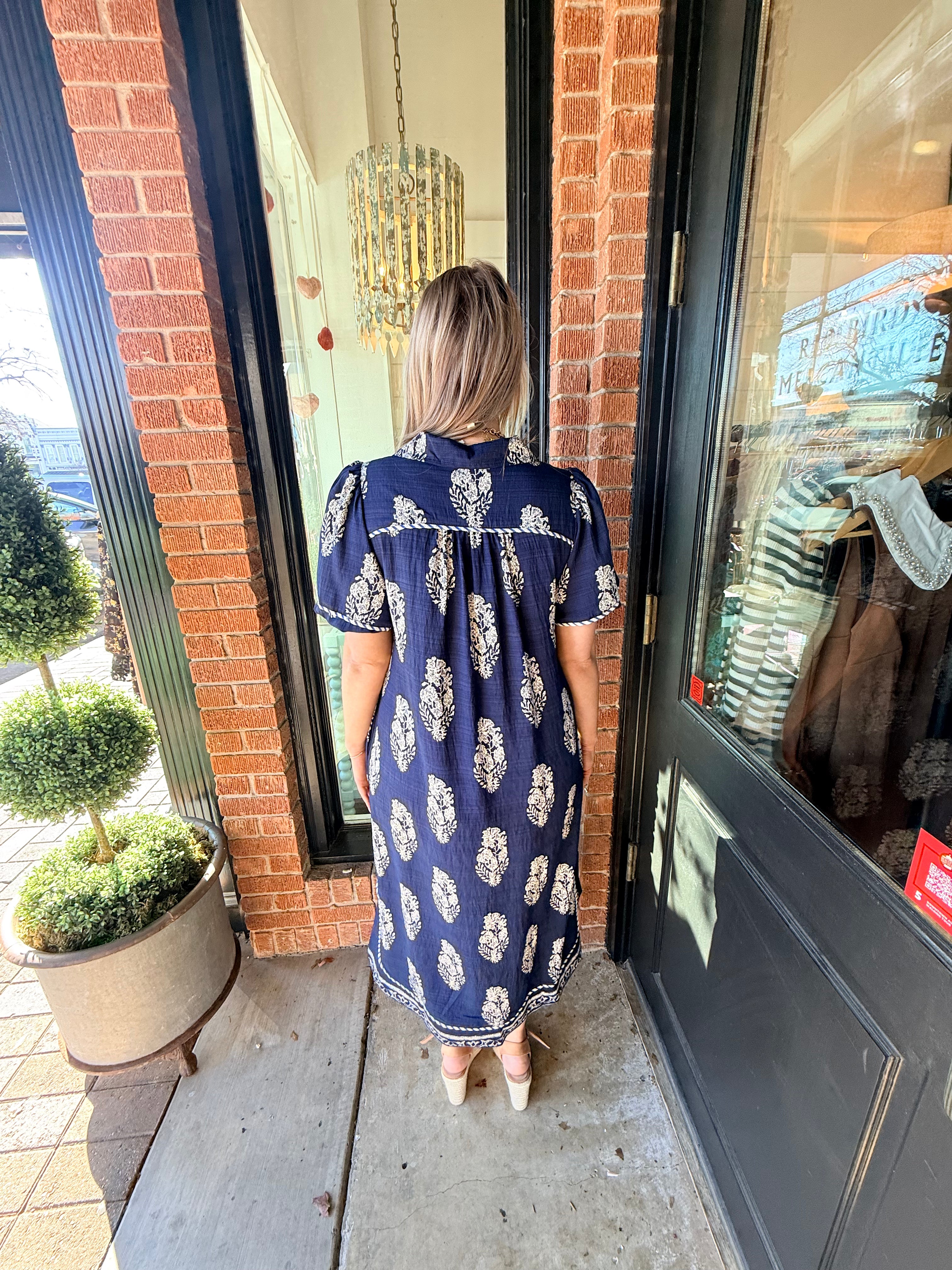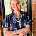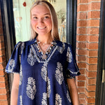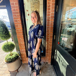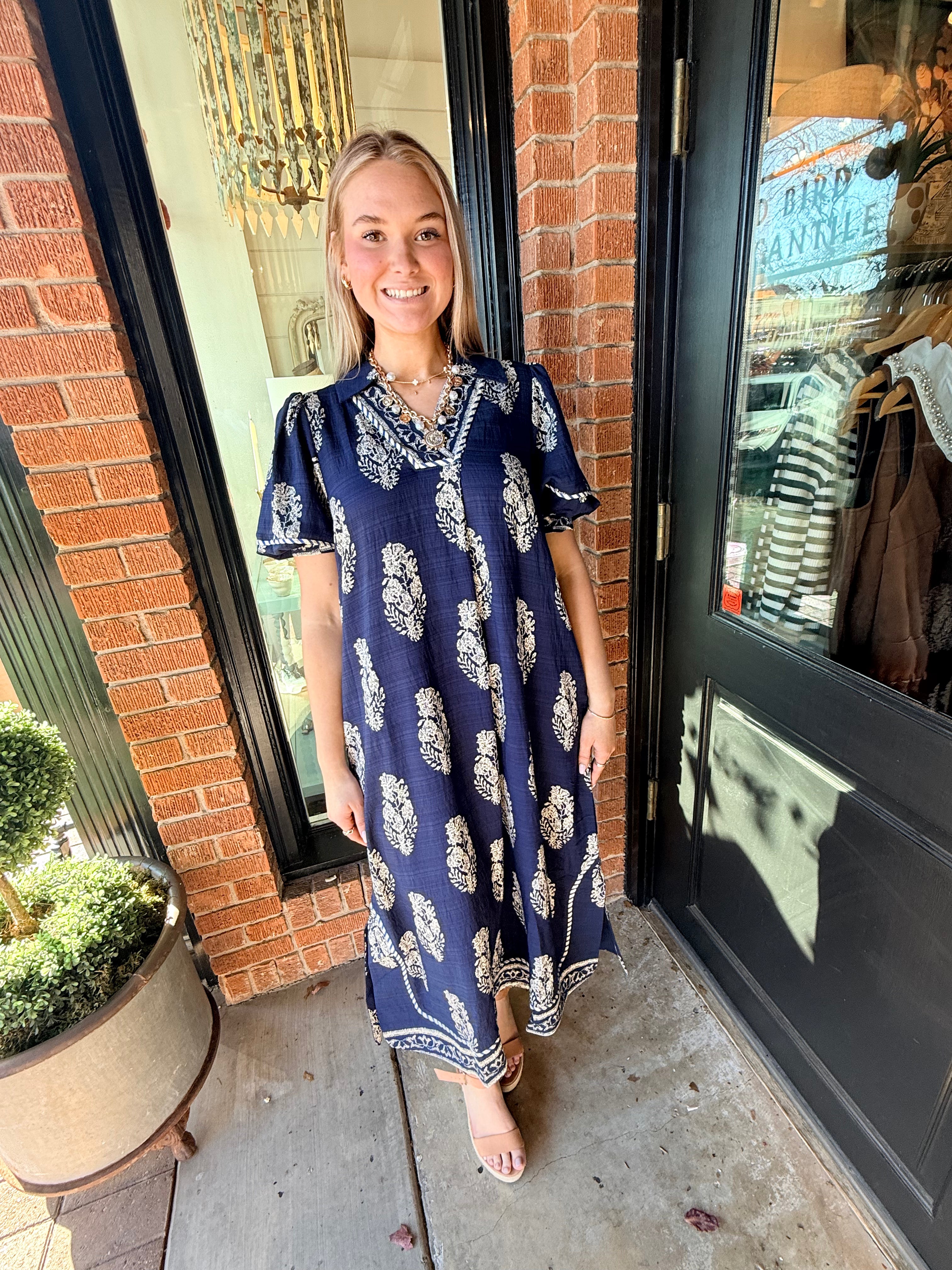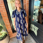 Easy and elevated, the Wrenlee Border Print Collared Midi Dress features a beautiful botanic crest border print that brings a fresh, eye-catching look. Designed with a split neckline and relaxed, flowy silhouette, this midi dress moves beautifully while keeping things comfortable. Side slits add an easy touch of movement, making it perfect for everyday wear or casual outings.