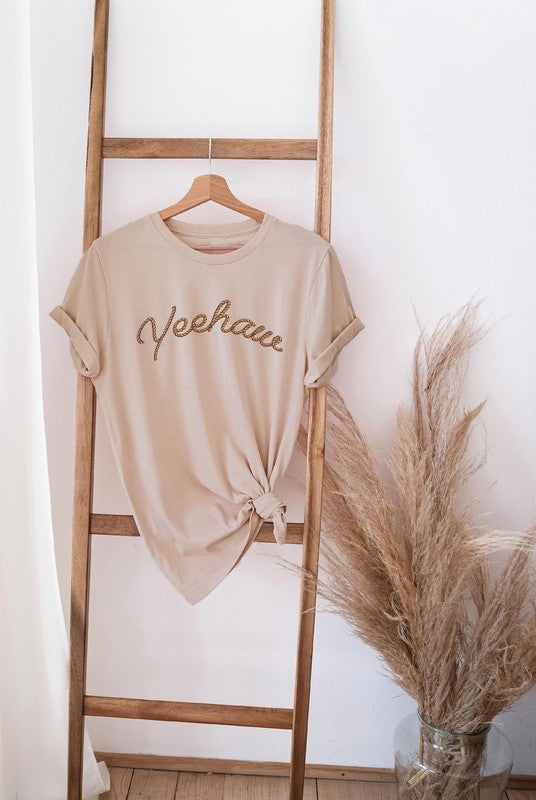 Expertly crafted with 100% cotton for solid colors and 52% cotton/48% poly for Heather, the Yeehaw Graphic T-shirt is the perfect blend of comfort and style. The relaxed unisex fit is ideal for any body type, while the hand screen printed design adds a unique touch. Made to order, this shirt is truly one-of-a-kind.
